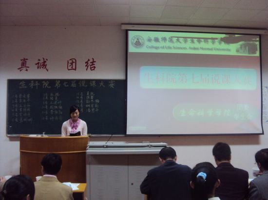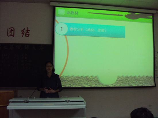 来自08级的共17位选手参加了本次的比赛。选手在8分钟的时间内,就“说教材、说教法、说学法以及说教学过程”4个方面展开讲解。经过精心的准备,参赛选手充分运用多媒体技术,以新课改为教学理念,向评委展示了自己精彩的说课。经过评委们公正的打分,最终评选出了一、二、三等奖,其中夏凯和贾丹丹同学获得了一等奖。