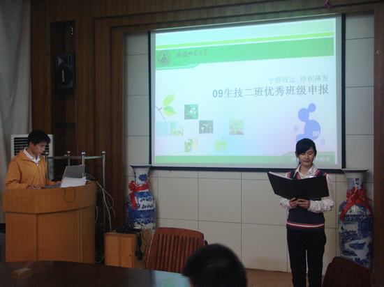 08、09级的共7个班级进行了汇报交流。伴随着一张张记录着班级成长的照片和一串串承载班级收获的数字,各参评班级汇报人从组织建设、日常管理、党团工作、思想教育活动、学风建设、校园文化活动、十无”“十佳”创建、、教室、公寓管理、早操活动、创新工作等各个方面介绍了班级的创建情况。