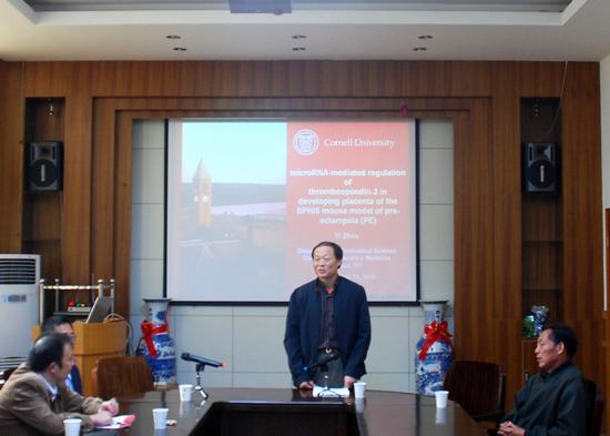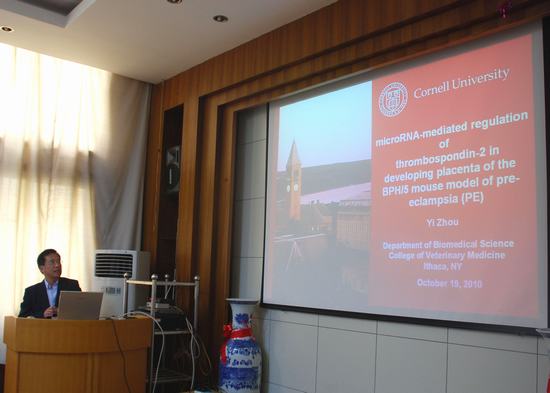 10月19日下午,应生科院邀请,美国康乃尔老员工物医学科学系研究员周毅博士在公司一楼学术报告厅作了题为《microRNA-mediated regulation of thrombospondin-2 in developing placenta of the BPH/5 mouse model of pre-eclampsia (PE)》的学术报告。报告会由科研副经理张小平教授主持,公司有关专业教师、研究生100余人聆听报告会。