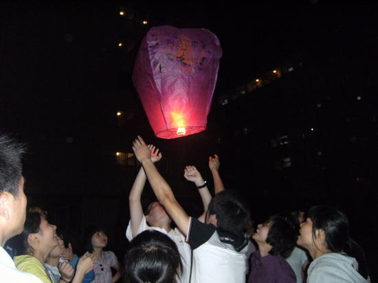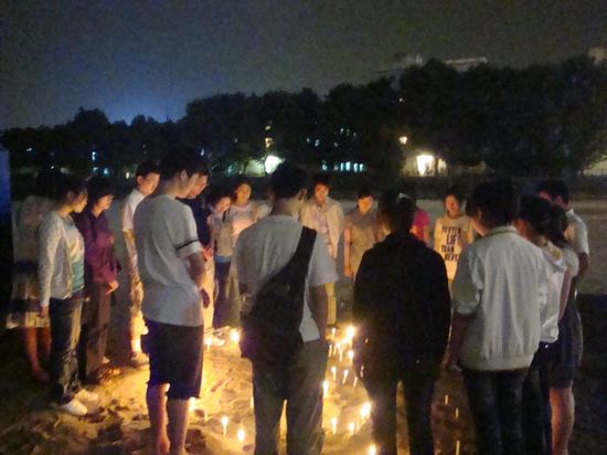 晚上20点30分,全体同学到东操场举行了以“点亮心灯,照亮灾区,祝福世界”为主题的祈福活动。同学们点亮摆放好的100根蜡烛,夜幕下的操场寂静而肃穆,闪烁的红烛组成了心形的光环,5.12三个数字在心形光环中更显沉重和忧伤。随着主持人致开幕词,活动正式开始,大家怀着沉重的心情同唱《让世界充满爱》,以此表达对所有受灾同胞的祝福。最后,在沉重的音乐声中同学们放飞孔明灯,放飞祝福,放飞希望,许多路过同学的支持与参与把活动推向了高潮。