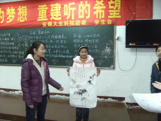 同学们参观了聋哑公司的展厅,了解了公司的发展历史和现状。当看到员工的绘画、剪纸等美术作品时,同学们无不赞叹他们的心灵手巧。接着,聋哑儿童和同学们进行了无声的交流,纸笔是交流的媒介,微笑是共同的语言。大家一起进行了“一个比划一个猜”和“蒙眼画画”等趣味游戏,小朋友们异常活跃,还热情地献上了街舞表演,动感舞姿折射出对生活的热爱。我们的傣族舞和街舞表演,也赢得了小朋友们幸福快乐的笑容。最后,同学们把自制的小礼物送给了小朋友,恋恋不舍地离开了这群可爱的孩子。