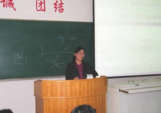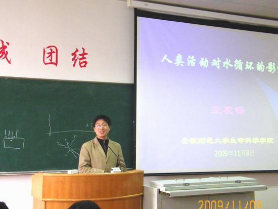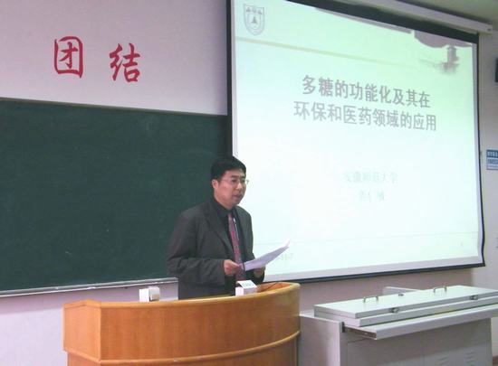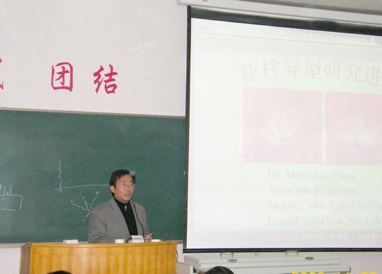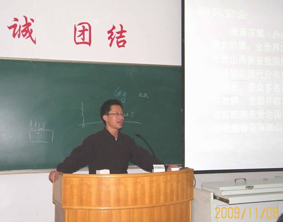 8日上午的精彩报告由公司龚仁敏教授、王友保副教授、陈明林副教授、邵剑文副教授、李君老师给大家带来。龚仁敏老师以纤维素、壳聚糖为例,介绍了多糖的功能化及其在环保和医药领域的应用;王友保老师从生态角度介绍了人类活动对水循环的影响,增强了同学们的环保意识;陈明林老师就花柱异型特征研究所取的成果给同学们做了报告;邵剑文老师分析了毛莨叶报春在物种分类学上存在的问题,并从形态和分子角度给予了一定分类证据;李君老师针对加拿大一枝黄花在不同地理种源的耐热适应性所做的研究进行了专题报告。