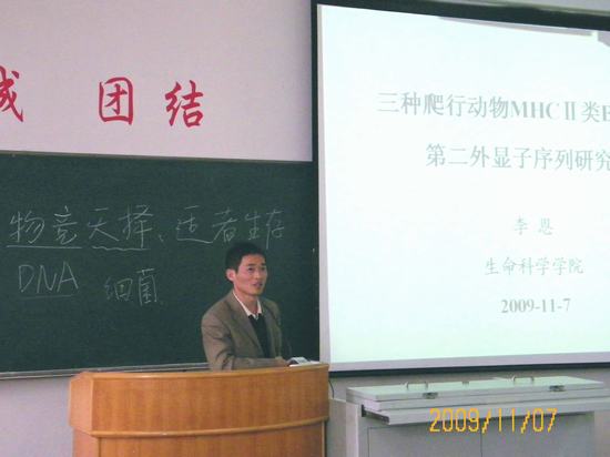 7日上午,公司李晋老师、林凌老师、李恩老师、张方副教授分别做精彩报告。李晋老师从动物生理学角度对濒危物种金头闭壳龟重要生理指标随季节性变化进行了报告,强调了金头闭壳龟保护的严峻形势和动物生理学研究在其保护上的重要作用;林凌老师以能源危机为切入点,阐述了定向进化技术改造内切葡聚糖酶活性研究在实际应用中的重要价值;李恩老师就乌龟、石龙子、扬子鳄三种爬行动物的MHC II类B基因第二外显子序列研究进行了报告;张方老师的报告根据牛蛙叫声音频的特征性分析了我国舟山群岛五个岛屿牛蛙叫声的变异情况及其和原始北美牛蛙叫声的特异性,为研究环境对物种的变异影响提供了很好的佐证。