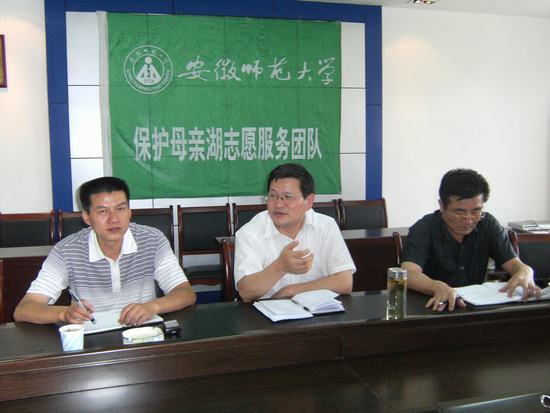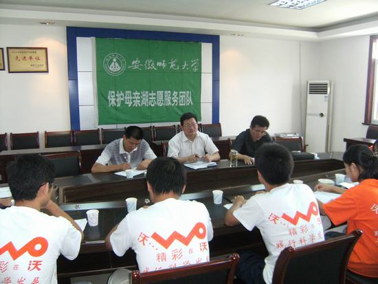 顾家山一行的到来受到了巢湖渔业管理局领导、巢湖市环保局领导和社会实践团队师生的热烈欢迎。顾书记仔细询问了同学们本次实践活动的情况,并对团队的实践成果和同学们的吃苦耐劳、服务社会的精神给予了充分的肯定。