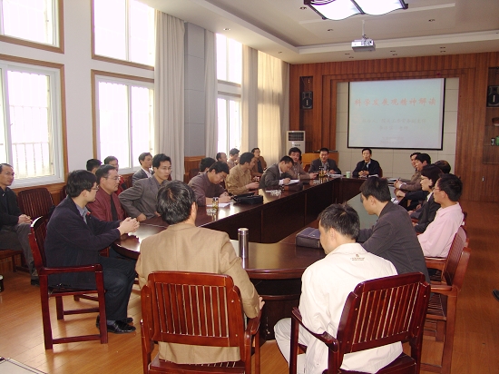 4月21日,m88官网举办学习科学发展观专题学习报告会,院关工委常务副主任李沛儒老师应邀作了题为“科学发展观精神解读”的专题报告,全院教职工聆听了报告。院深入学习实践科学发展观活动小组副组长、党委副书记周伍主持学习报告会。
