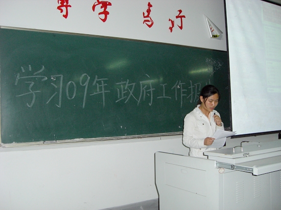 随后,学员们系统学习了温家宝总理在今年十一届二次全国人大会上所作的政府工作报告,并观看了3月13日的温总理答中外记者问的视频录像,温总理的机智、幽默和诚恳的深深打动了同学们,更是激发了同学们的爱国热情,纷纷走上讲台,积极发言,阐述自己对于政府工作报告的理解和认识。