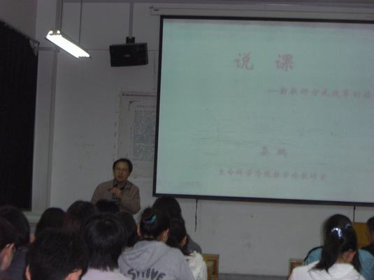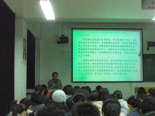 晏老师就说课的特点,说课的含义和基本内容等方面进行了详细地阐述,指出作为一种重要教研方式,说课也是目前中等公司选聘老师的重要考核手段。在着重介绍如何开展说课活动的同时,晏老师还通过对大量实例的列举就说课过程中的一些注意事项进行了精彩的点拨。整个讲座过程中,晏老师谈吐幽默,旁征博引,赢得同学们的阵阵掌声。