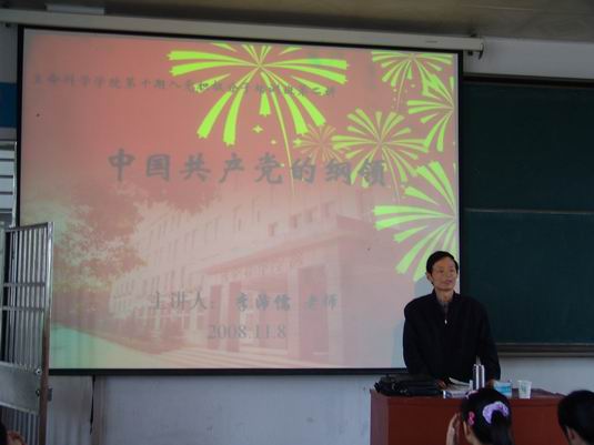最后,李老师希望同学们加强十七大精神的学习和讨论,在具体的实践中慢慢领悟党的理论知识的精髓,从而自觉学习、宣传党的路线、方针和政策,不断提高政治理论水平和思想认识水平,努力早日成为光荣的中国共产党党员。