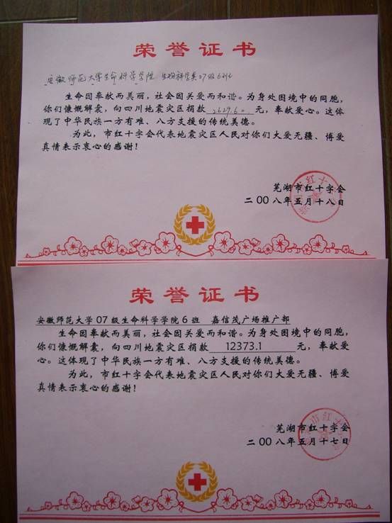 07生科6班的社会募捐于15日晚开始,截至17日傍晚,同学们累计募集到人民币20511.60元,这些爱心捐助将由芜湖市红十字会和芜湖市慈善总会分别负责转交给灾区人民,支援那里的同胞抗震救灾,重建家园。
