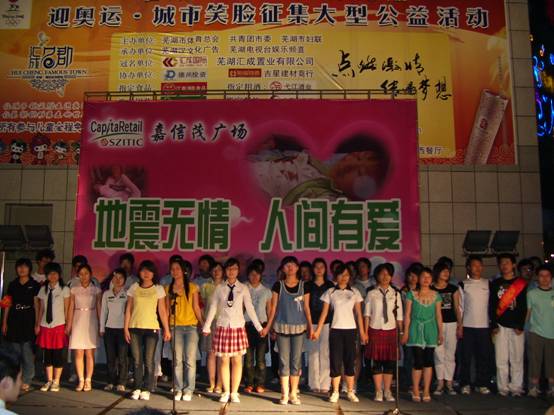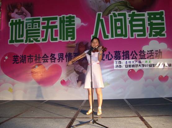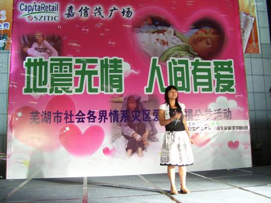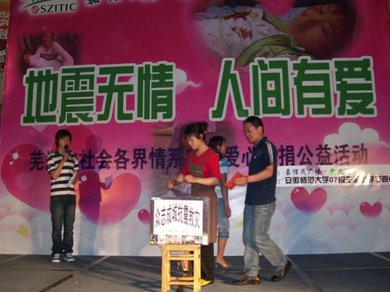 5月16日晚,m88官网2007级生物科学类6班与嘉信茂广场共同举办了主题为“地震无情,人间有爱——芜湖市社会各界情系灾区爱心募捐公益活动”的赈灾义演晚会。