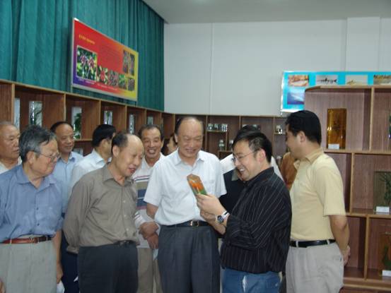 解说员在向领导们介绍公司教师发现并发表的植物模式标本