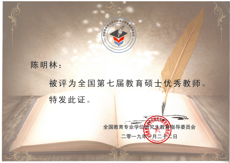 本网讯 (刘再群)近日,全国教育专业学位研究生教育指导委员会授予公司陈明林教授“全国第七届教育硕士优秀教师”光荣称号。