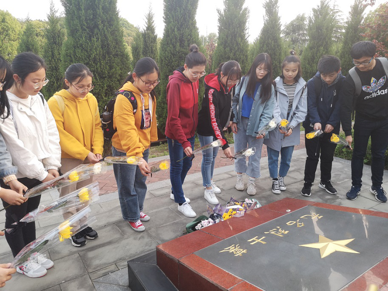 在革命烈士纪念碑前,学员们举行了庄重的缅怀仪式,首先向革命先烈致敬并集体默哀三分钟,表达了对革命先烈虔诚的瞻仰之情和深切的哀思。苍翠的松树,整齐庄严,高耸的石碑,雄伟肃穆。石碑上深深地刻着"革命英雄永垂不朽"几个大字。长眠于此的,是一位位伟大的革命战士,是一个个不屈的魂灵。国难当头时,他们身先士卒,舍生取义,山河破碎时,他们血染黄土,青山埋骨。他们用自己的生命守卫了他们生长的土地,却也永远的长眠于这片土地。学员们被革命先烈们的忠诚之心和为国为人民献身的精神所折服。在此次活动的最后,同学们在一位无名烈士墓前长鞠一躬,并且为这位烈士献上了花朵,以寄托对革命先烈的敬仰与哀思。