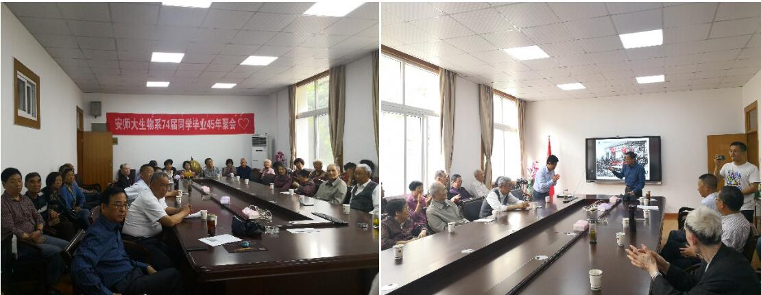 本网讯(生科院 潘川 汪倩倩)时光如水,岁月如歌。生物系1974届34位同学从五湖四海相聚师大,开展为期两天的聚会活动。5月18日下午,74届员工们在生化楼公司会议室开展座谈交流。座谈会由员工翁屹教授主持,公司党委书记蒋学波代表公司领导出席了师生座谈会。