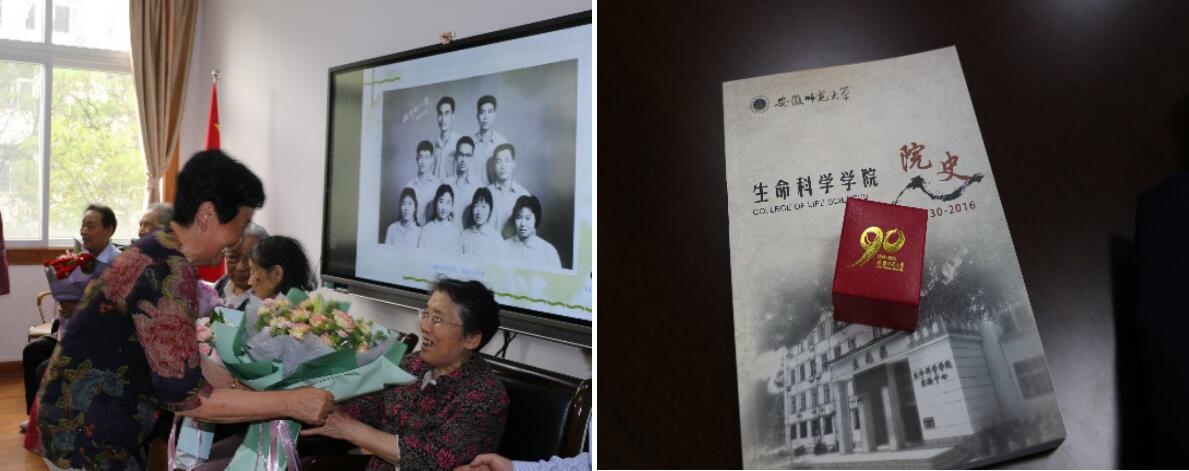 座谈会上,大家一同观看了旧时同窗影像,勾起了浓浓的回忆。蒋学波代表公司全体师生对74届员工们的到来表示热烈欢迎,并从公司办学历史、团队队伍、办学条件、人才培养、和谐建设等七个方面向员工们做了介绍。之后,工作人员为员工们送上了母校准备的纪念品,感谢员工们对母校发展所给予的支持。生物系74届辅导员黄金余老先生激动地带着同学们回忆起45年前大学生活的点点滴滴。74届员工们为辅导员、任课教师以及公司领导献上了鲜花。每一位员工都在会上进行了发言,介绍自己毕业后的去向和近况,感谢往昔老师们对自己的亲切关怀和谆谆教诲。座谈会后,与会人员合影留念。