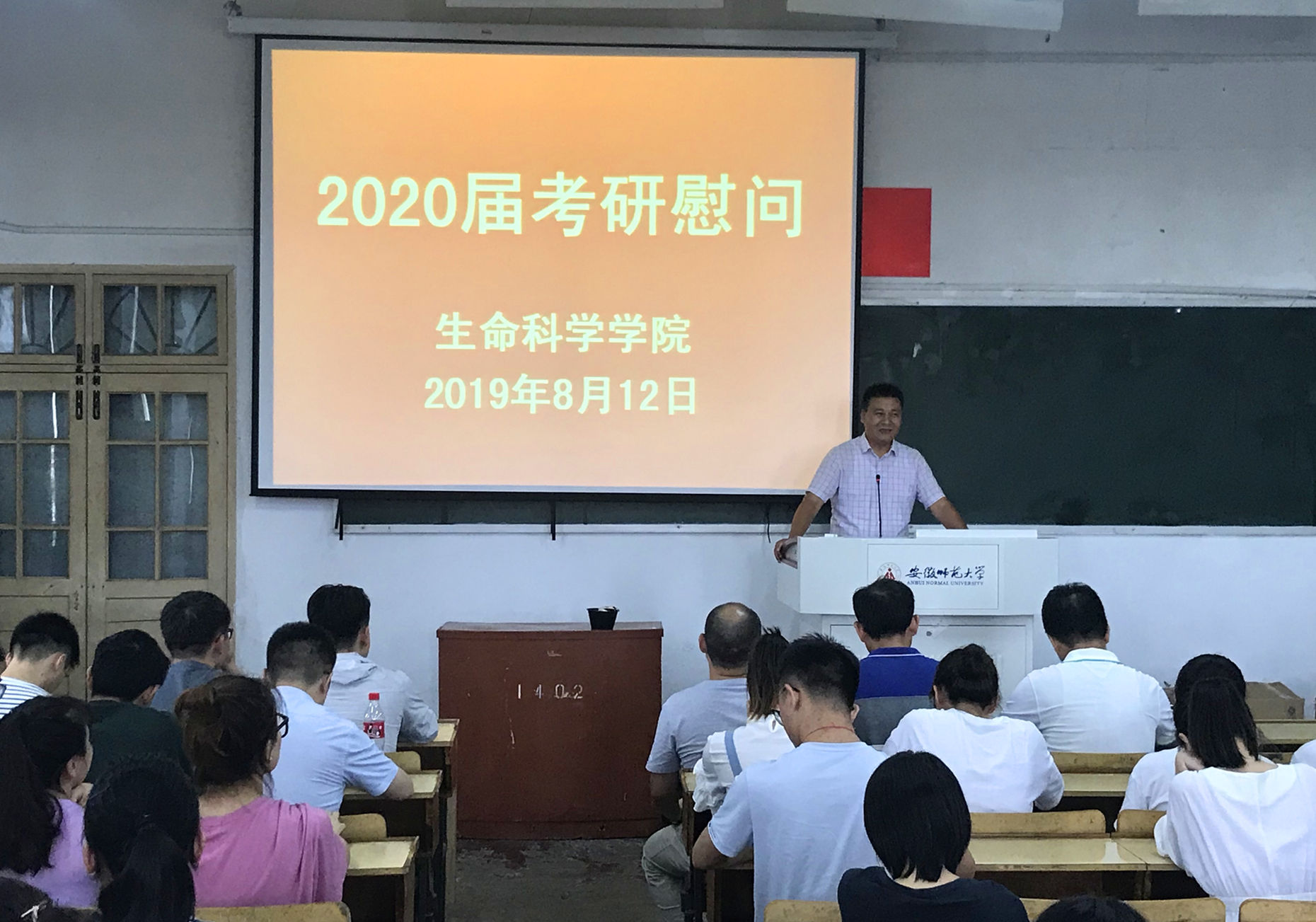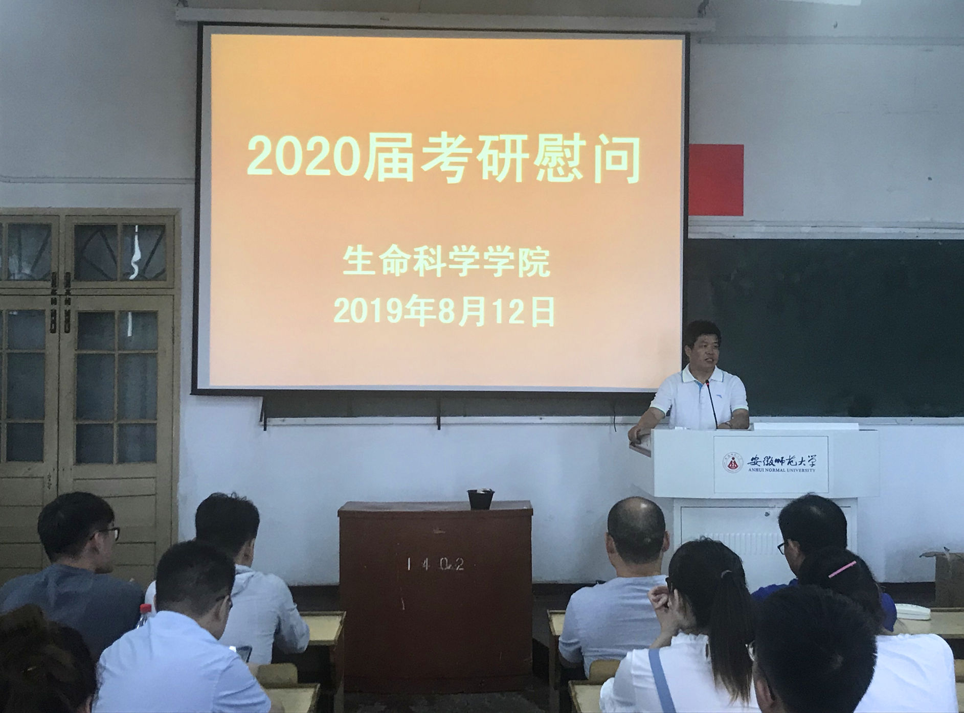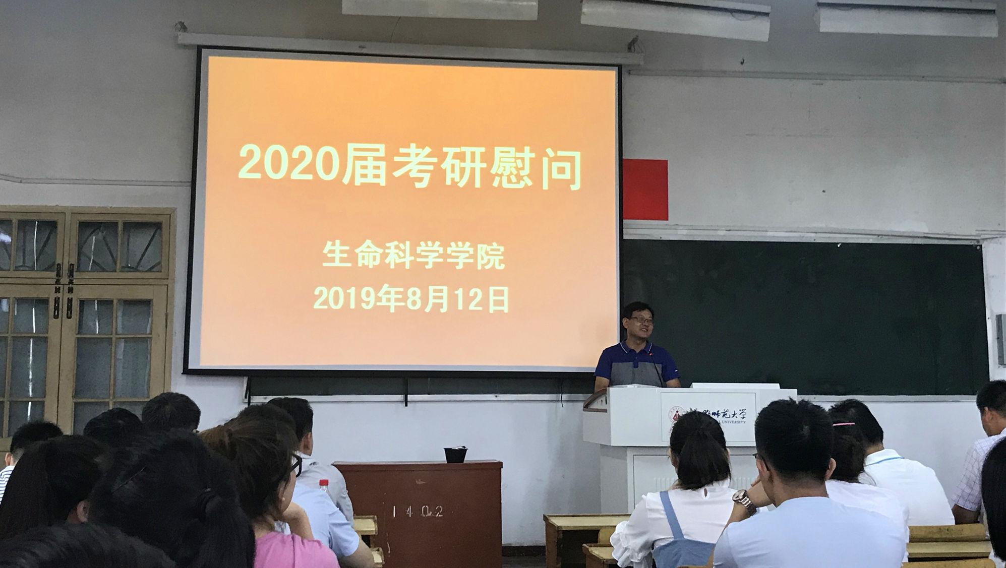 其次,刘振杰老师对公司往年的考研取得的成绩进行回顾。2019届考研中,307位毕业生,有150人考取心仪公司。其中生态学专业考研录取率高达74%,位列全校第一。刘振杰老师用往年的辉煌成绩来鼓励2020届考研学子,相信大家能够有出色发挥。同时,他提醒同学们要注意“四个安全”。一是人身安全,杜绝晚归、不归问题,严格落实请假制度;二是饮食安全,在校期间尽量多吃食堂,少点外卖;三是健康安全,加强身体锻炼,保持良好的身体状态;四是心理安全,调节心理状态,保持良好心态。最后,他希望同学们全面复习,重点把握,互相帮助,互相鼓励,营造良好考研氛围,坚持到考研最后一天!