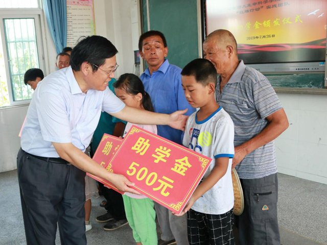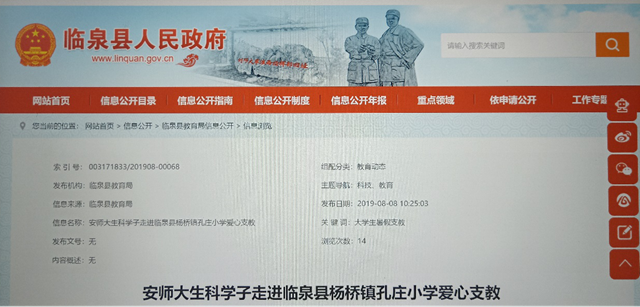 砥砺奋斗,勇担时代责任。今年暑期,来自生物科学(师范)、小学教育、体育教育等6个不同专业的12名志愿者们经过前期信息搜集和实地考察,确定了农村小学的教育短板,开设趣味数学,英语,音乐,手语,体育,自然科普等课程以及防艾禁毒主题活动、户外动植物认知、“朗读者”经典诵读比赛,叶脉书签制作活动,主题教育系列讲座,趣味运动会,文艺汇演等特色活动。针对国家级贫困县的留守儿童,团队通过前期线上线下爱心募捐,向孔庄小学的6名困难员工发放助学金3000元。在实践中,团队得到了临泉县教育局、团委、妇联,杨桥镇中心校老师等的大力支持,纷纷参与其中,支教活动还得到了临泉县政府宣传报道。