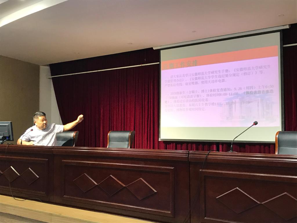 9月19日下午,m88官网在图书馆报告厅召开2019级研究生入学班会。参加此次会议的有研究生秘书刘再群老师和全体2019级研究生,会议由研究生辅导员夏齐平老师主持。
