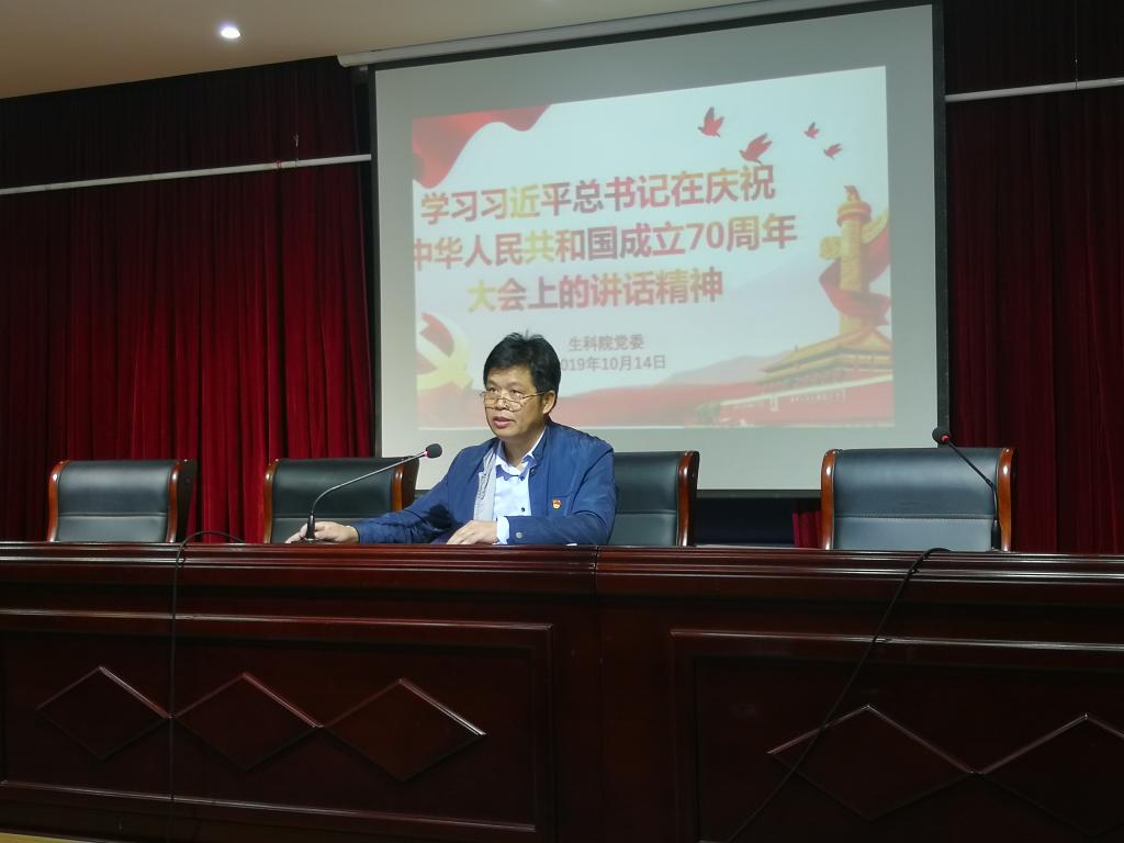 本网讯(生科院 汪倩倩)10月14日下午,生科院在图书馆报告厅召开教职工理论学习会,集中学习习近平总书记在庆祝中华人民共和国成立70周年大会上的重要讲话精神,部分员工党员也参与了集中学习。会议由公司党委书记蒋学波主持。