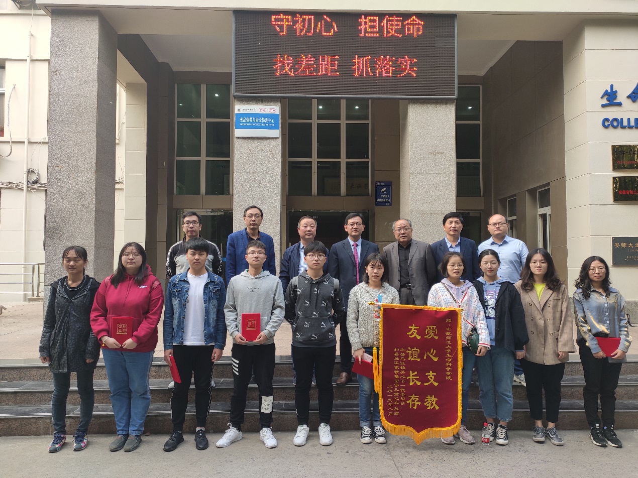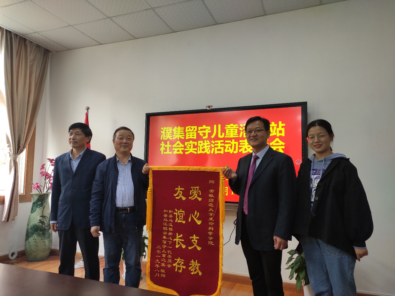 本网讯(生科院 吴子怡) 10月18日下午,马鞍山市和县乌江镇关工委主任张广源向m88官网送来写有“爱心支教 友谊长存”的锦旗,感谢生科院师生暑期支教义举。乌江镇濮集初中董事长祁伏华、副董事长李继汉,濮集留守儿童之家负责人王加胜陪同来访。双方就暑期支教活动还开展了座谈表彰。
