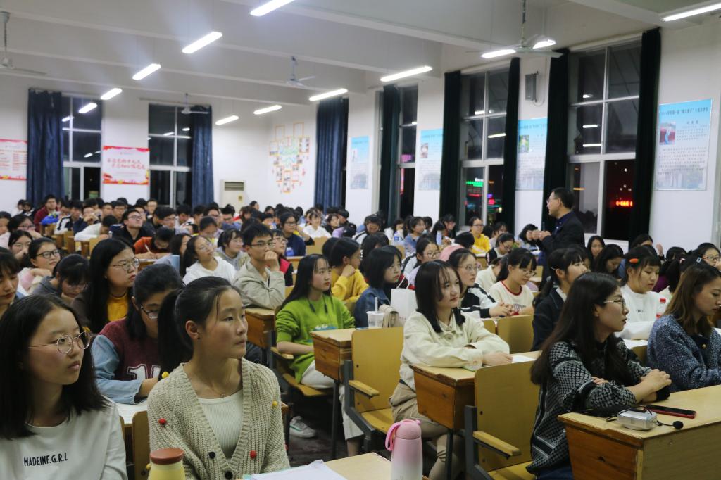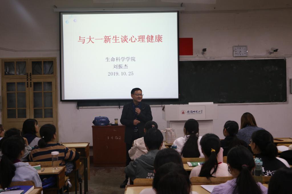 本网讯(生科院 胡玮 黄琳怡)为了增强员工对心理健康的重视,培养员工良好的心理素质和健康快乐的心态,10月25日晚19:00,党委副书记、心理咨询师刘振杰于教学楼1401教室开展“与大一新生谈心理健康”讲座。辅导员胡玮、蒋璐璐、孙凡及2019级全体新生参加讲座。