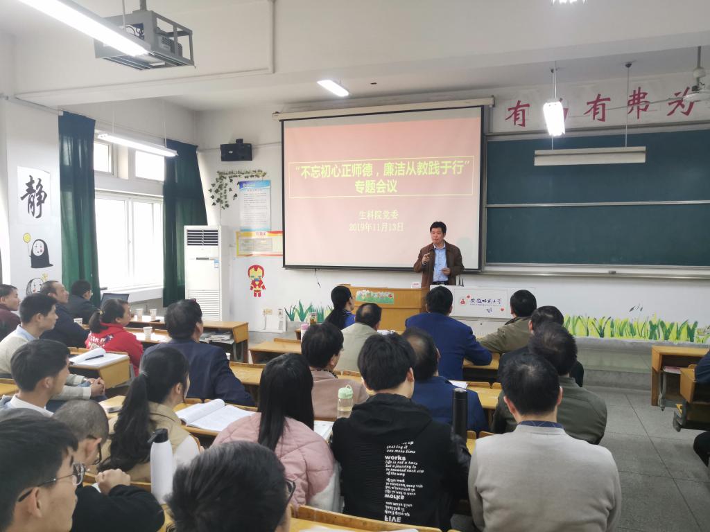 本网讯(生科院 潘川)2019年11月13日下午,生科公司党委召开“不忘初心正师德、廉洁从教践于行”专题会议,全院导师和部分研究生参加会议。会议由公司经理吴孝兵主持。