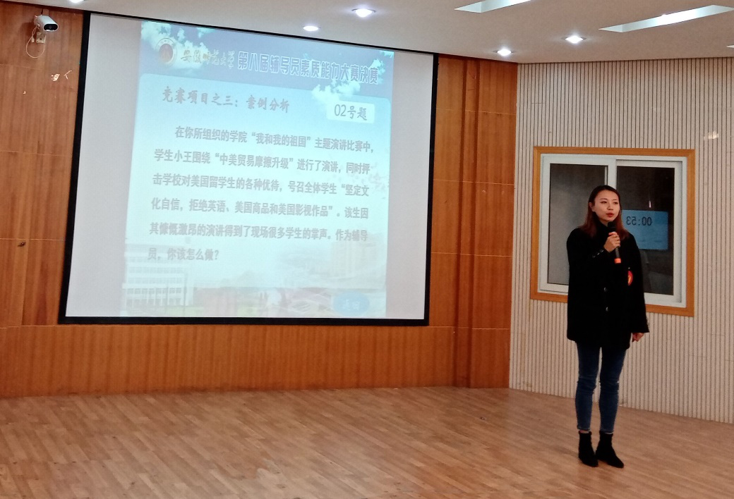 大赛分为预赛、决赛两个阶段,历时近一个月,全校共有116名辅导员参赛。在公司10月24日举行的预赛中,经过基础知识测试、网文写作、主题班会策划书和班情熟知等项目的评选,最终蒋璐璐和其他公司九名辅导员晋级决赛。11月5日,公司举行了主题班会决赛现场展示环节的比赛。11月15日的决赛分谈心谈话、理论宣讲、案例分析三个环节。比赛现场,十名辅导员选手们思维敏捷、思路清晰、导向正确,竞争异常激烈。蒋璐璐凭借良好的理论素养、扎实的知识储备和娴熟的工作能力,落落大方、从容应答,充分展示了积极向上的精神面貌和良好的职业素养,给评委和观众留下了较好的印象。
