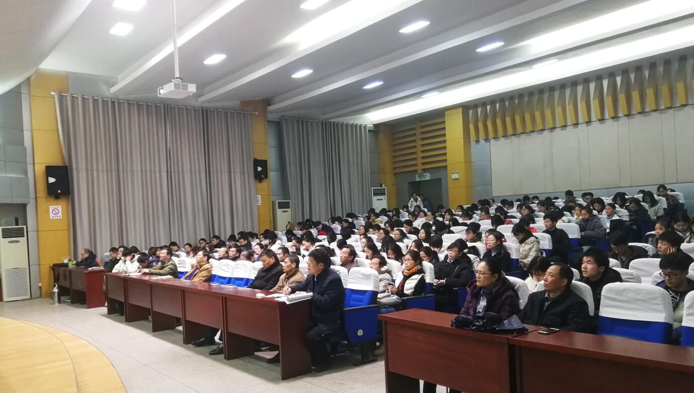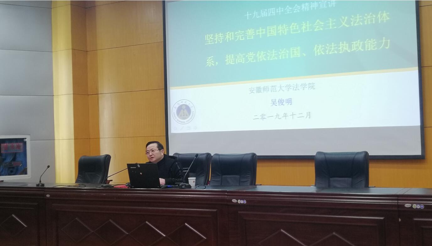 本网讯(生科院 何馗馗/文 汪倩倩/图 )12月18日下午,生科公司党委邀请校十九届四中全会精神宣讲团成员、法公司吴俊明教授作了题为《坚持和完善中国特色社会主义法治体系,提高党依法治国、依法执政能力》的报告。报告会由公司党委书记蒋学波主持。公司教职工和2018级本科生参加了报告会。