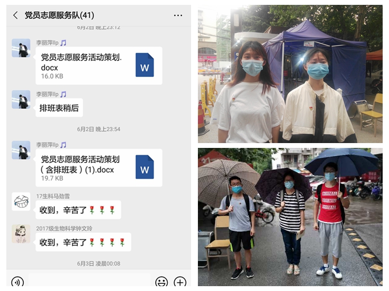 6月中下旬,芜湖开始进入汛期,出现连续的暴雨天气,路面积水严重。但在这样恶劣的条件下,赭山校区的西门执勤岗位上,仍然会准时打伞执勤的党员。他们认真地监控着进出的人员,严格把关,防止校内员工私自外出,不给病毒任何进入校园的机会。“下雨了就打伞执勤,路面有积水就穿拖鞋。”m88官网2017级生物科学的马劲雪这样说道。磅礴的大雨浇不灭党员们走在抗疫一线的热情,路面的积水也不足以成为他们前进的障碍。这是一种责任,也是一种担当。