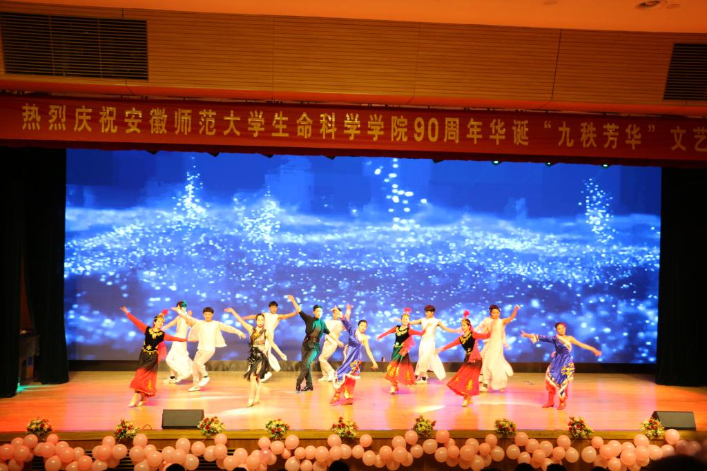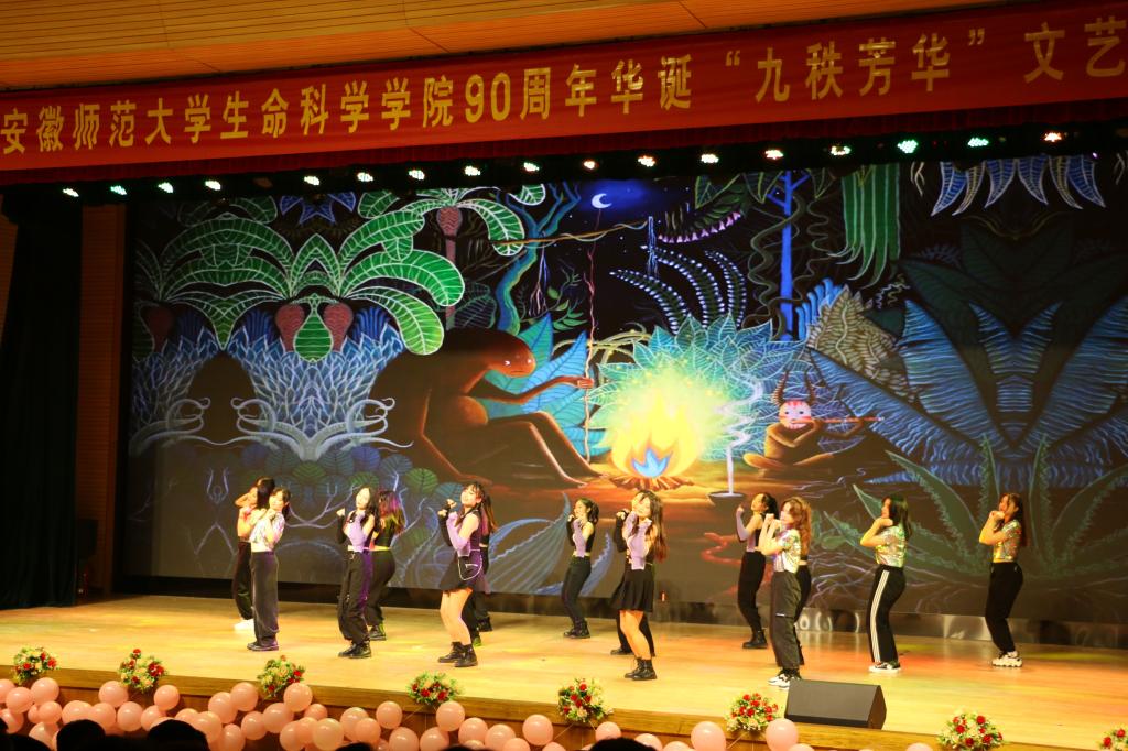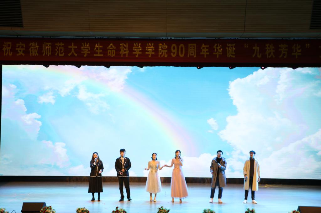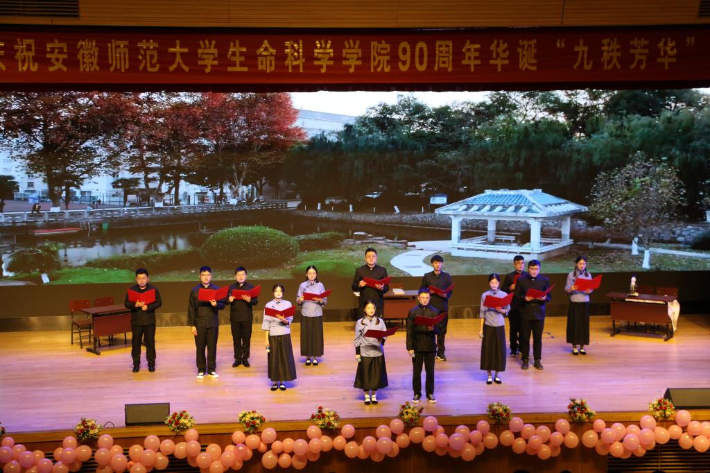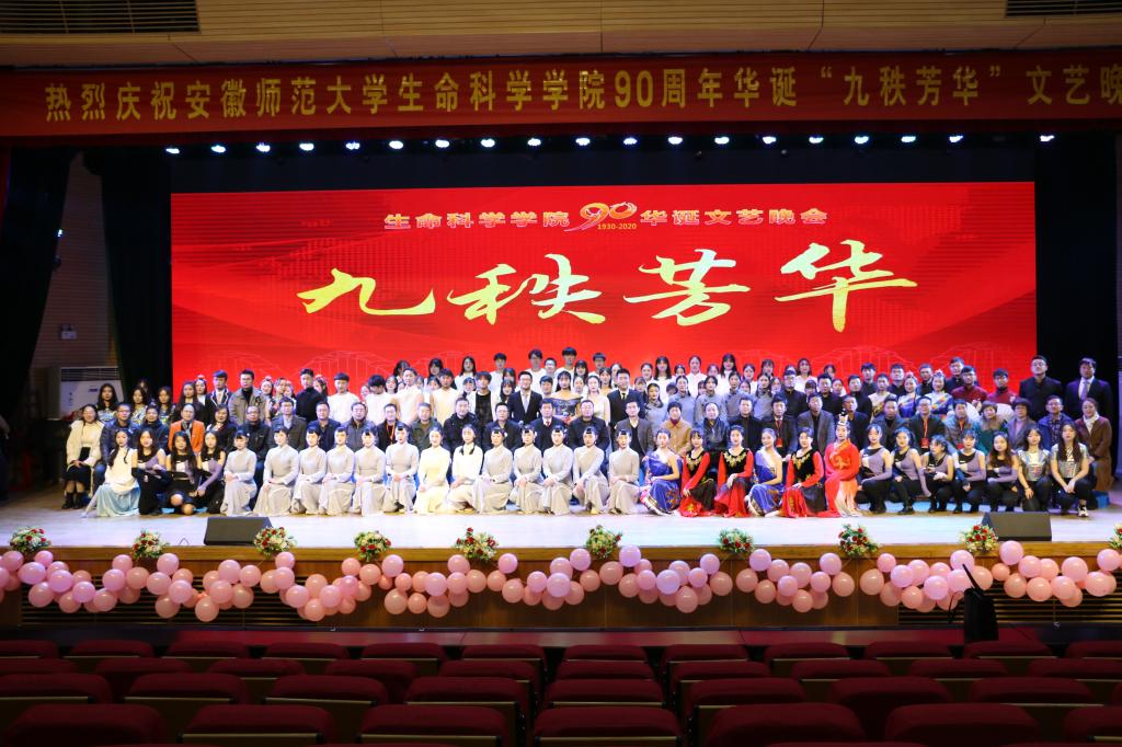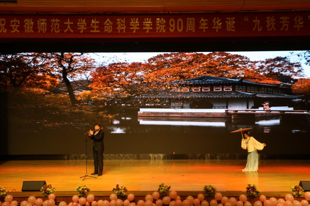 本网讯(黄琳怡 胡玮)11月27日晚,师大附中大礼堂彩灯璀璨,座无虚席,舞台两侧的条幅“立德树人守初心不负时代重托,全面发展担使命无愧青春韶华”熠熠生辉,热烈庆祝安徽师范老员工命科学公司90周年华诞“九秩芳华”文艺晚会正在精彩上演。返校参加院庆的海内外员工、省内外高校兄弟公司的领导老师、友好合作企业负责人,公司部门负责人以及公司领导、老师、员工代表近千人观看了晚会。