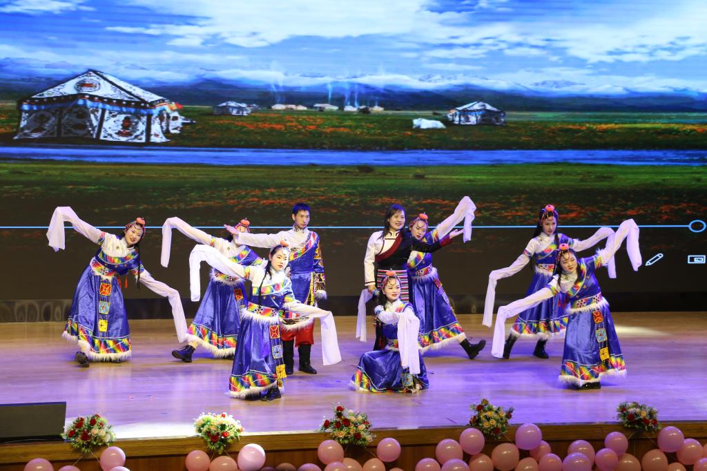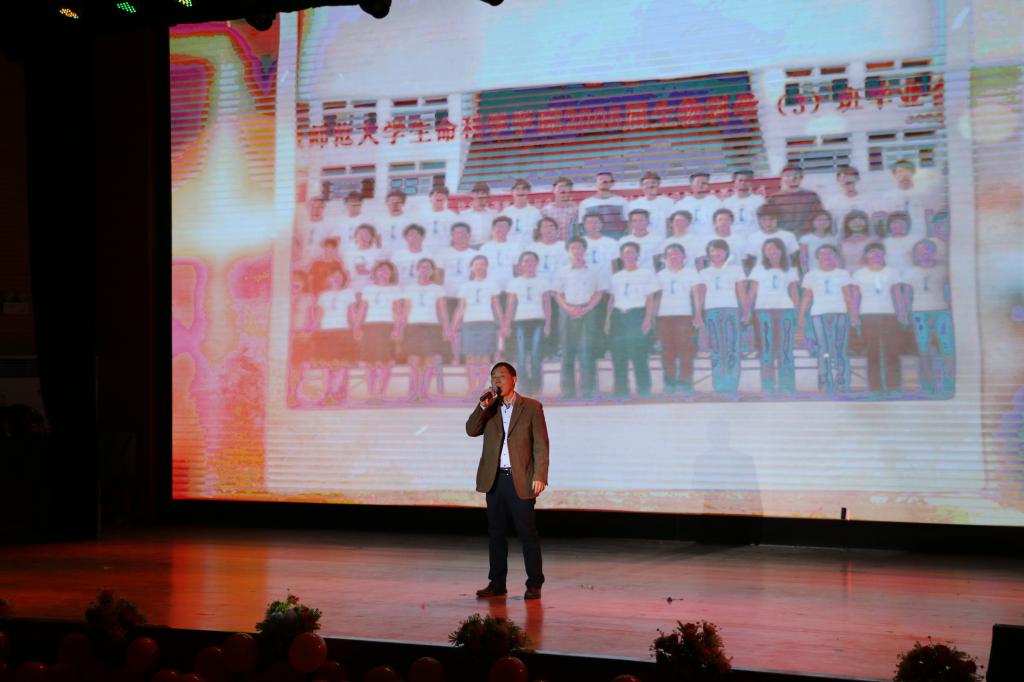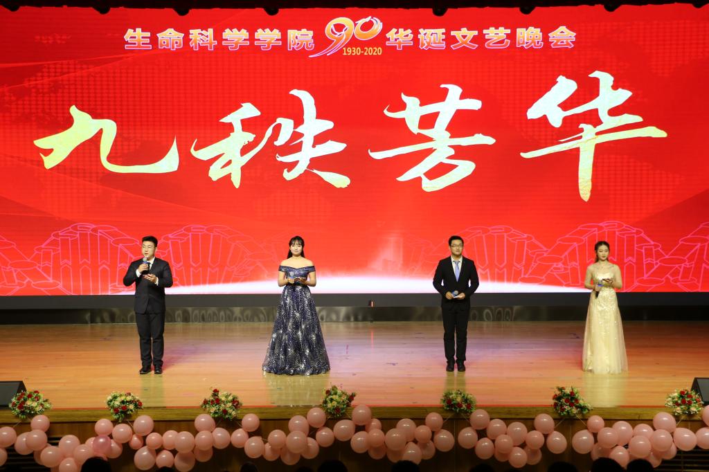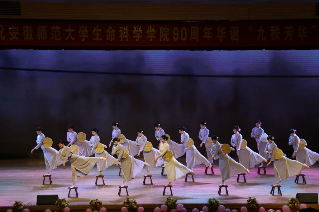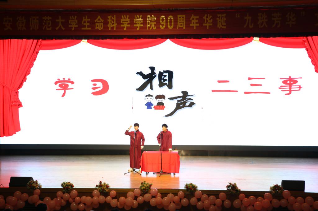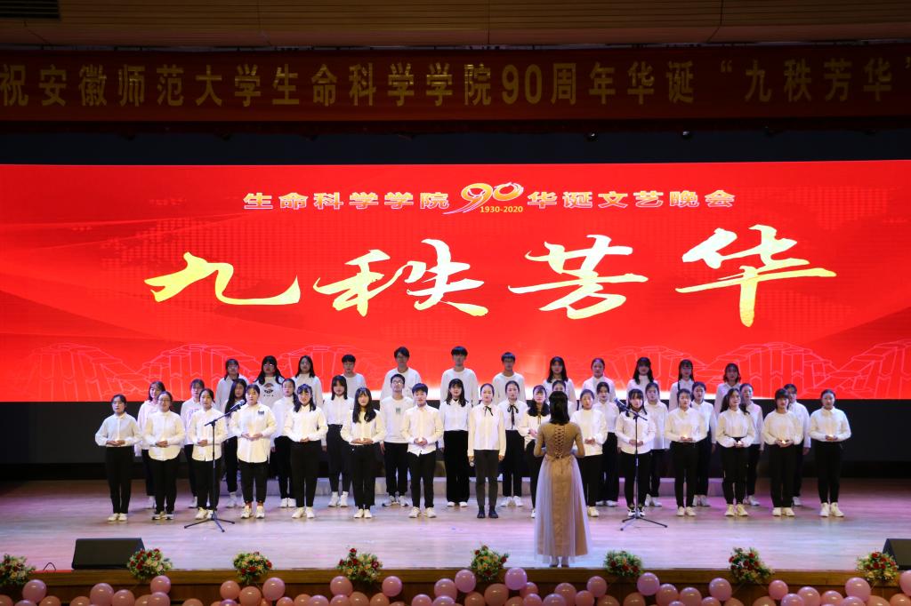 本网讯(黄琳怡 胡玮)11月27日晚,师大附中大礼堂彩灯璀璨,座无虚席,舞台两侧的条幅“立德树人守初心不负时代重托,全面发展担使命无愧青春韶华”熠熠生辉,热烈庆祝安徽师范老员工命科学公司90周年华诞“九秩芳华”文艺晚会正在精彩上演。返校参加院庆的海内外员工、省内外高校兄弟公司的领导老师、友好合作企业负责人,公司部门负责人以及公司领导、老师、员工代表近千人观看了晚会。