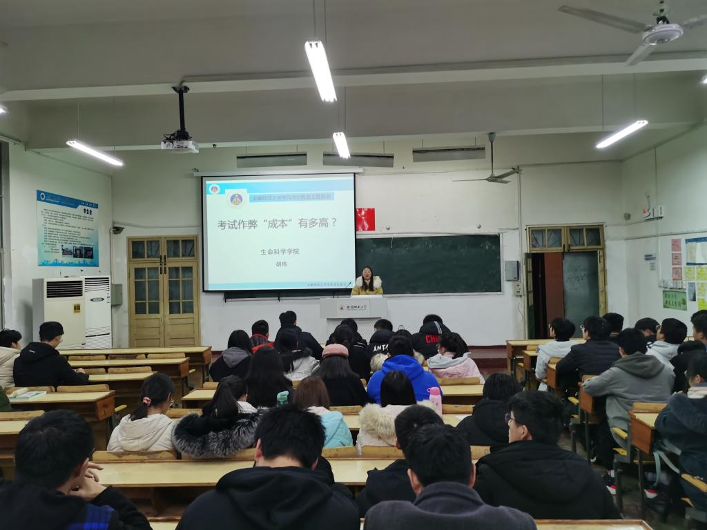寒意渐浓,期末将至。为了提高同学的诚信考试意识,培养同学诚实有信的品质,2020级生物工程一班、二班以及生科拔尖班于12月29日在教学楼1401教室由辅导员胡玮带领开展诚信考试教育主题班会。