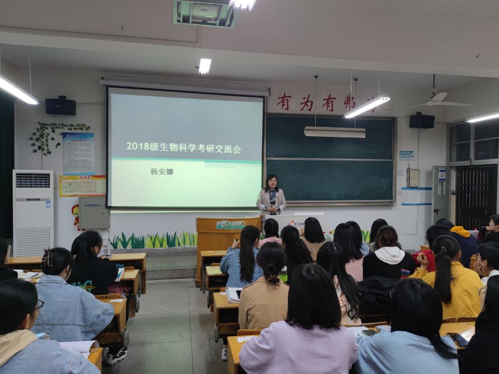 本网讯(生科院 李梦凡)4月19日晚7点,2018级生物科学、生物科学(中外合作)班级在田楼8308教室召开考研经验交流主题班会。专业负责人杨安娜出席,2017级郑如意、伊然、李月、计雨婷、杨妍妍、金姜苹、朱澳云依次分享了自己的考研经验。班会由辅导员何馗馗主持。
