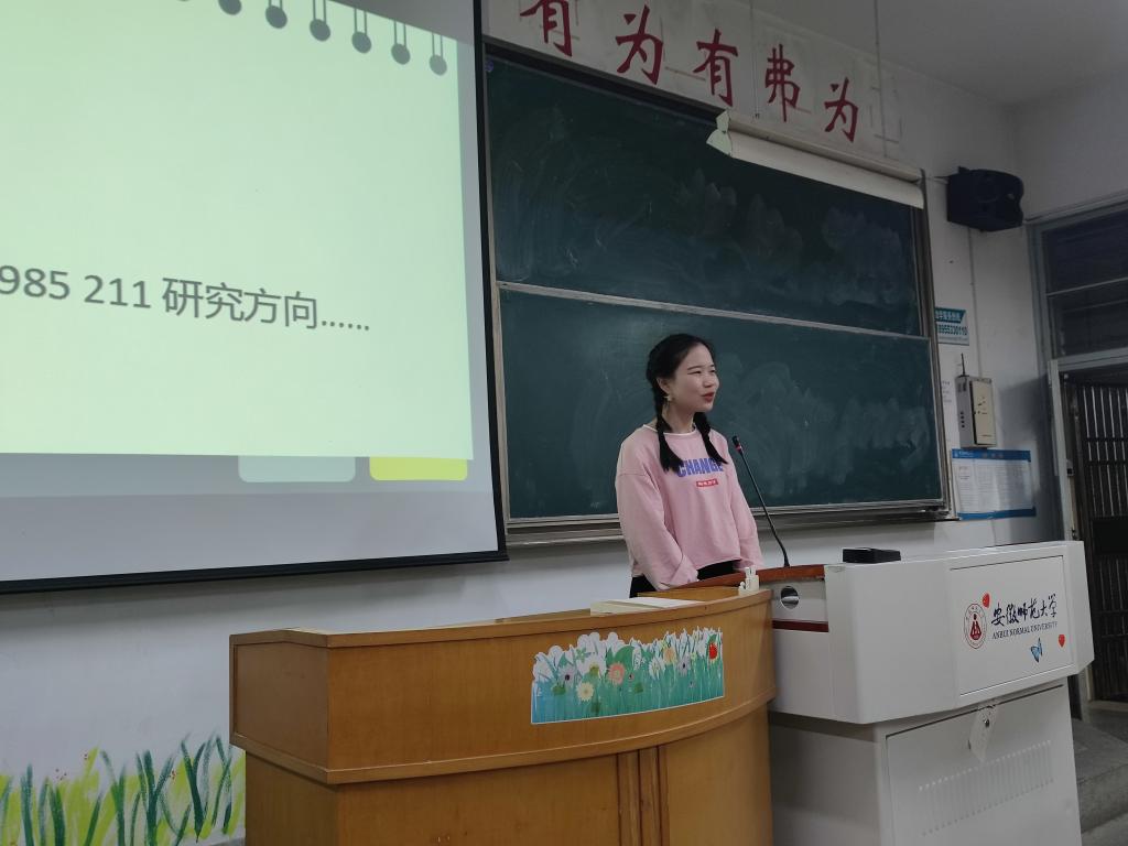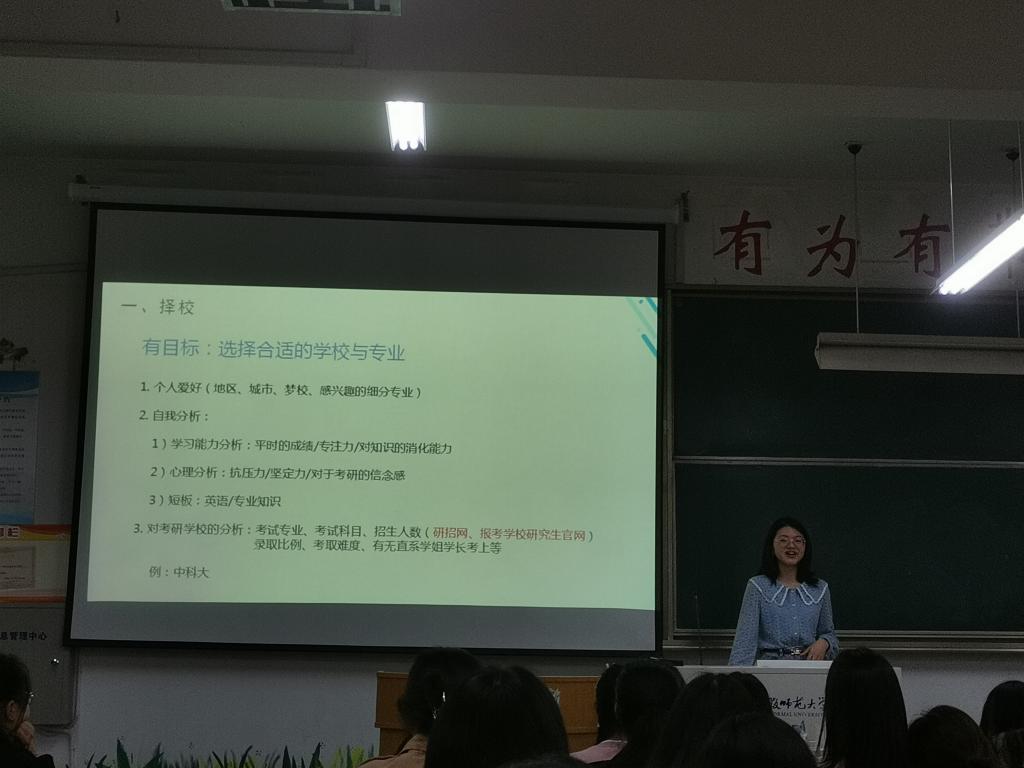 杨安娜做了考研动员指导。她回答了“为什么要考研?”“怎么选择公司?”“怎么备考?”等三个问题,全面细致地解答了同学们在考研择校、应试备考等方面的疑惑,鼓励同学们增强信心、培养恒心、不忘初心,绽放靓丽青春。