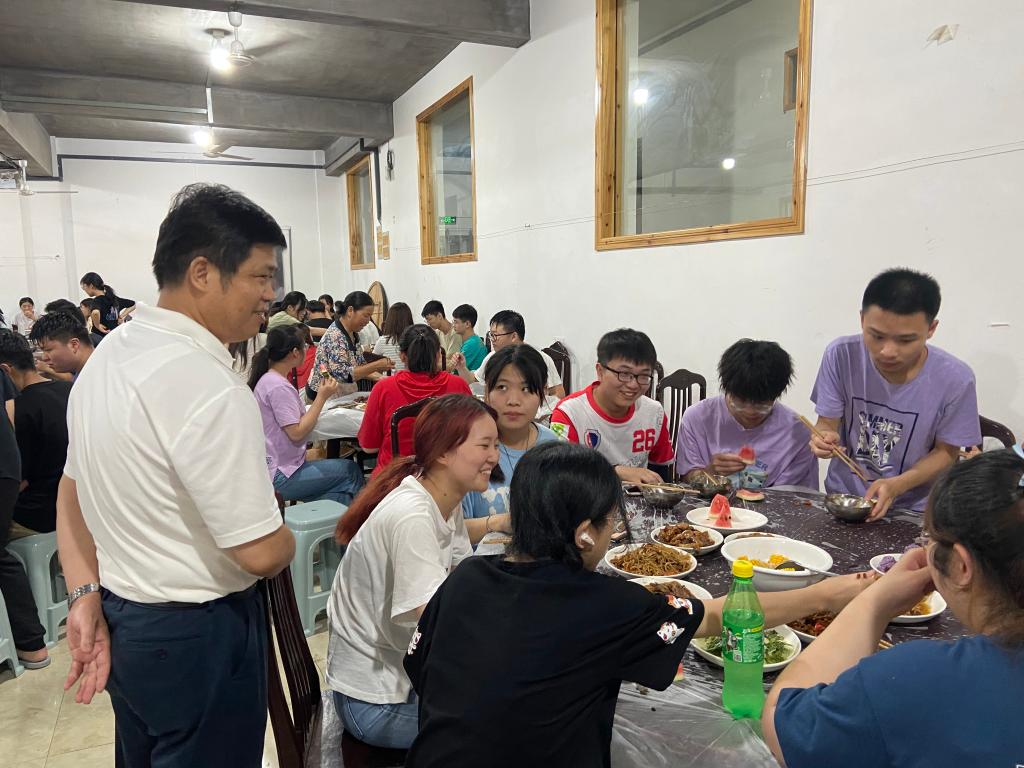 蒋学波向带队老师详细地了解了实习的进展,对同学们的学习任务完成情况给予了充分的肯定,并鼓励大家不怕困难,继续前进。随后,他又走访餐厅和宿舍,与同学们亲切交谈,询问心得体会。汪倩倩向师生再次强调了安全问题,她表示员工在实习期间需听从老师安排,做好防疫、人身和财物等安全防护工作,将安全放在第一位。