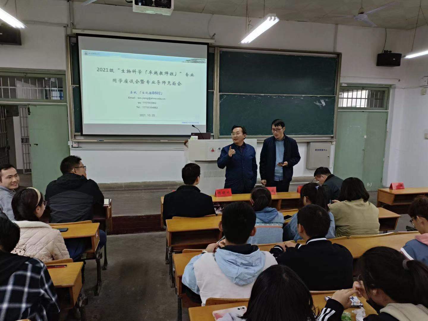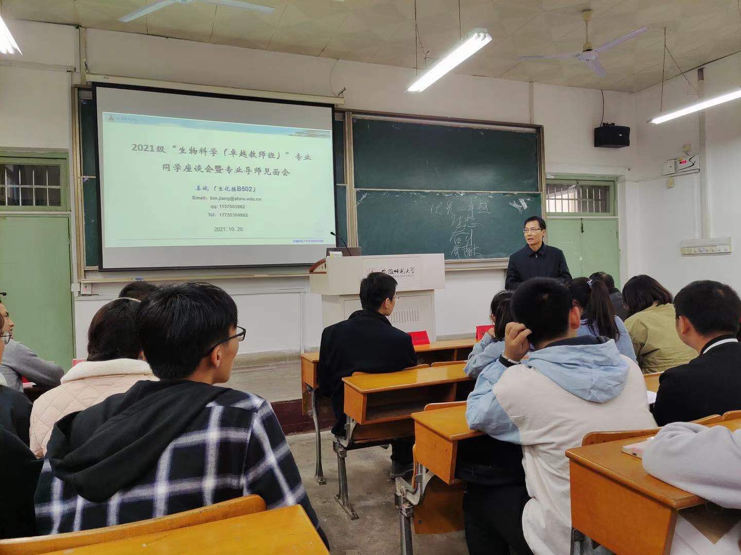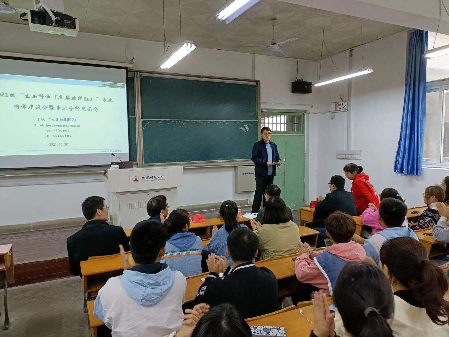 本网讯(生科院 周文娟 刘雨涵)10月20日下午,生物科学(卓越教师班)负责人姜斌老师在生化楼教室,组织并主持召开了专业导师见面会。出席本次座谈会的有姜斌,陈明林,刘再群,王晖,韩菲,卜兴江,潘涛等专业老师以及卓越教师班41名同学。
