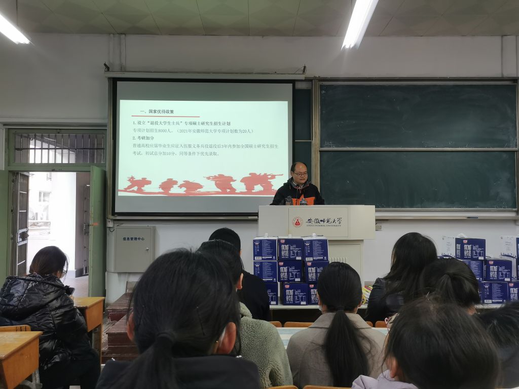 会上,蒋学波、汪倩倩、何馗馗分别做了动员宣讲。宣讲指出,青年老员工要勇于携笔从戎,将聪明才智融入强军梦想,献身国防事业,报效国家。围绕老员工入伍国家、芜湖市、公司等优待政策,包括经济待遇,就业优势和激励机制等进行了宣讲。还着重介绍了军营及退伍后发展路径。