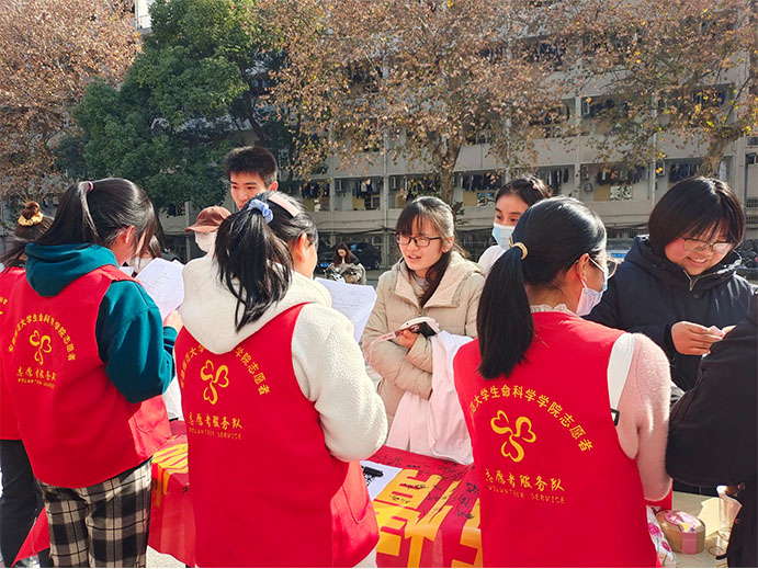 为响应习近平总书记关于志愿服务的号召,提高志愿积极性,12月5日,生科院在m88官方网站登录地址赭山校区组织开展以“微笑绽放多彩芜湖,志愿倾情魅力师大”为主题的12.5国际志愿者宣讲活动,志愿者结合当下时代主题从“志愿精神”、“责任感”、“使命感”等多方面,为同学们讲解志愿意义之所在,以及赭山学子的志愿故事,并在活动落幕后组织员工在宣传幅上签字,写下寄语。