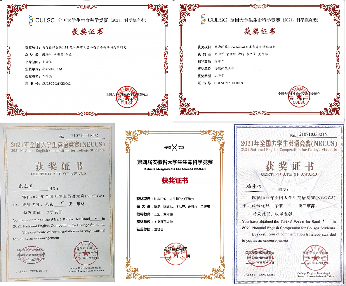1件作品获中国国际“互联网+”老员工创新创业大赛银奖,3件作品获全国老员工生命科学竞赛国家级一、二等奖,26项作品获安徽省“互联网+”大赛、老员工生命科学竞赛、老员工食品创新大赛、老员工标本制作大赛奖项,1人获老员工艺术展演国家级二等奖,2人获省级二等奖,30人获全国英语竞赛奖项。