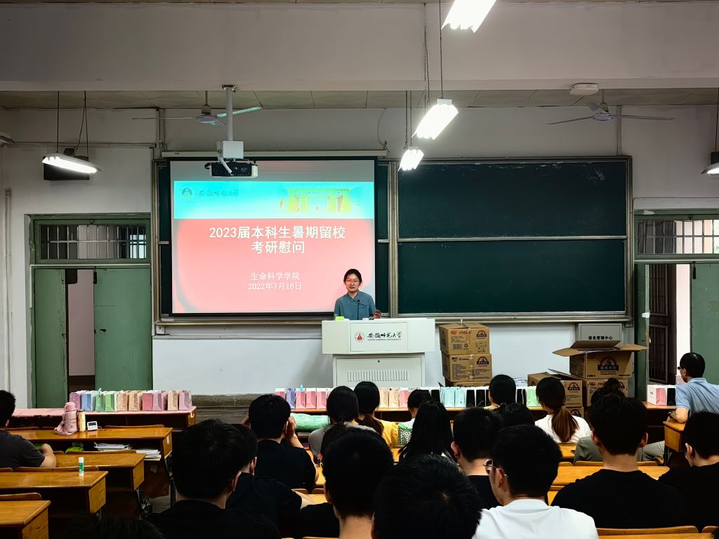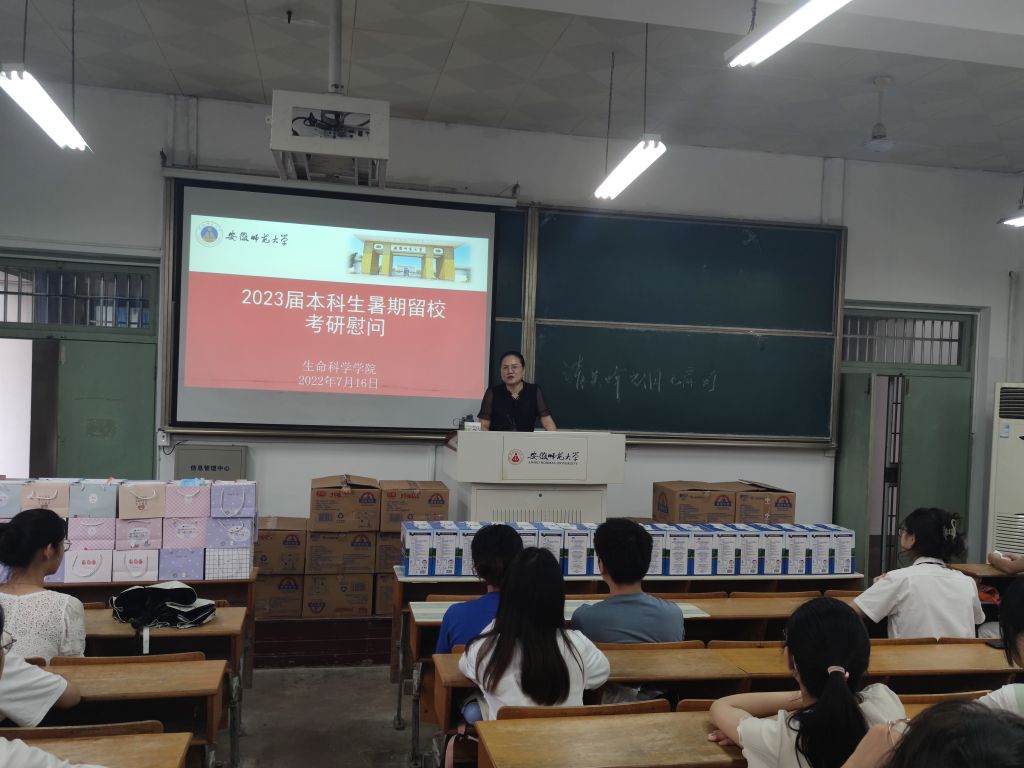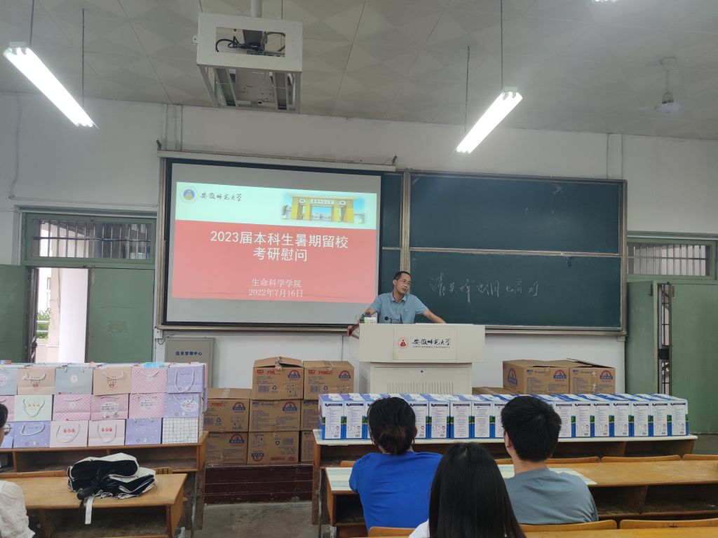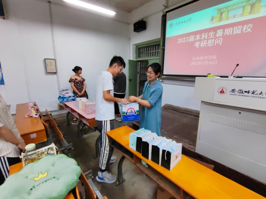 本网讯(生科院 史小龙)入伏首日,七月的芜湖,烈日炎炎。为给暑期留校考研学子助力,帮助他们安心备考,7月16日下午,生命科学公司在生化楼召开2023届暑期留校考研员工慰问会。院长朱国萍、学公司党委副书记汪倩倩、党委委员、副经理陈冬生和毕业班辅导员胡玮一同慰问员工。为考研员工送来牛奶、暖心包等,勉励同学们为梦想拼搏、为公司争光、为自己喝彩。