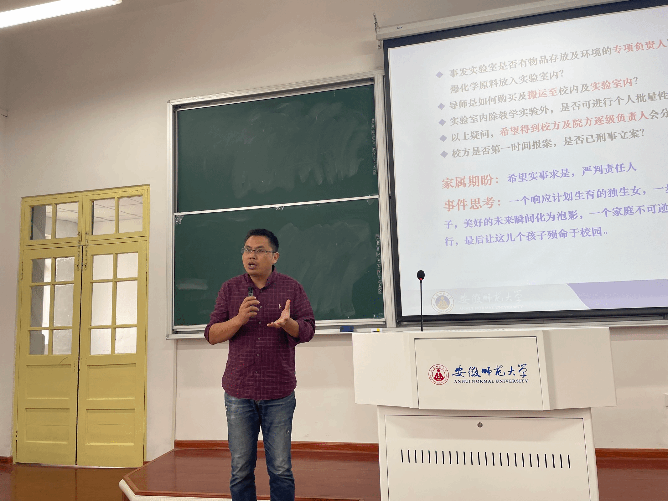 为了提高同学们的实验安全意识,曹正宇为全体研究生开展实验室安全教育培训。他重点强调了实验室安全工作的重要性,通过列举实验安全事故案例,以及责任体系和安全教育两方面的讲述,使同学们充分了解实验室安全工作的重要性,增强同学们实验室安全防范和自我保护意识。