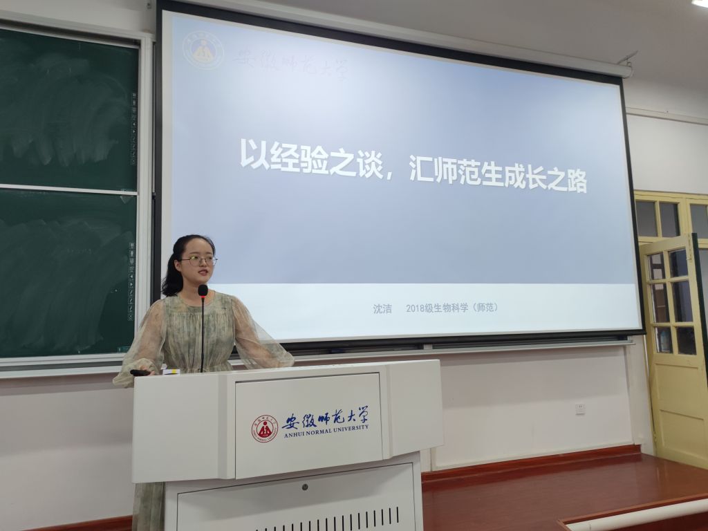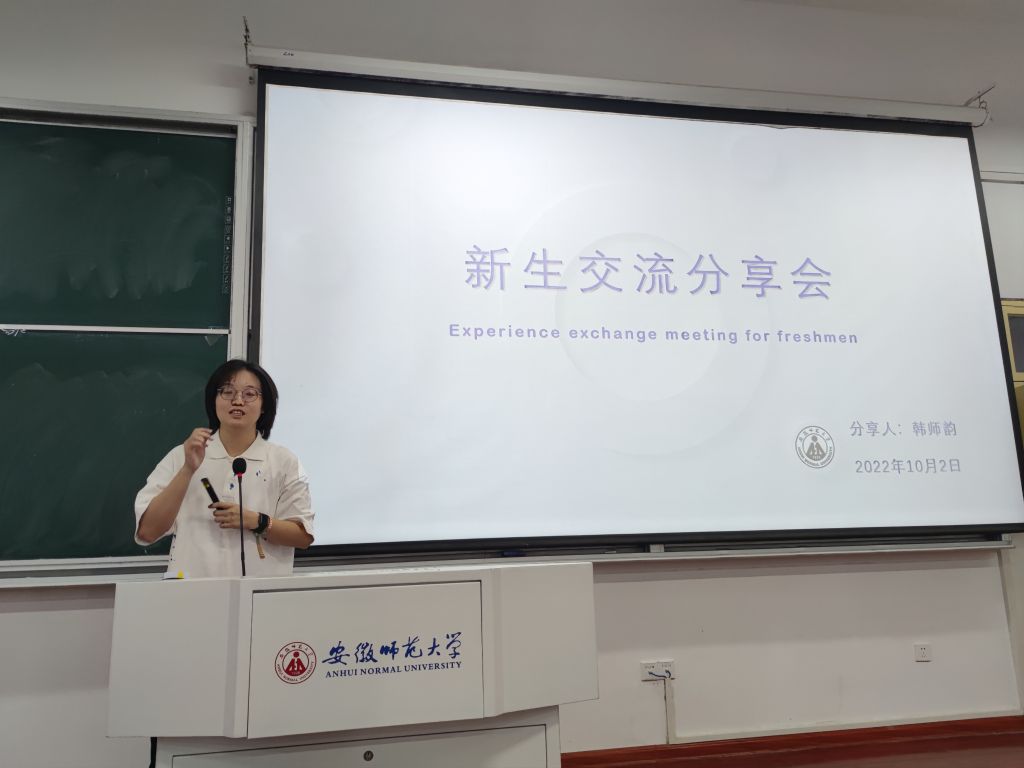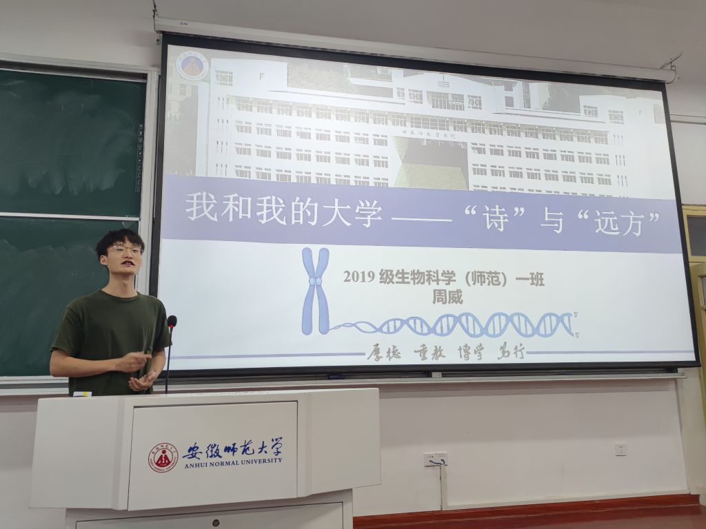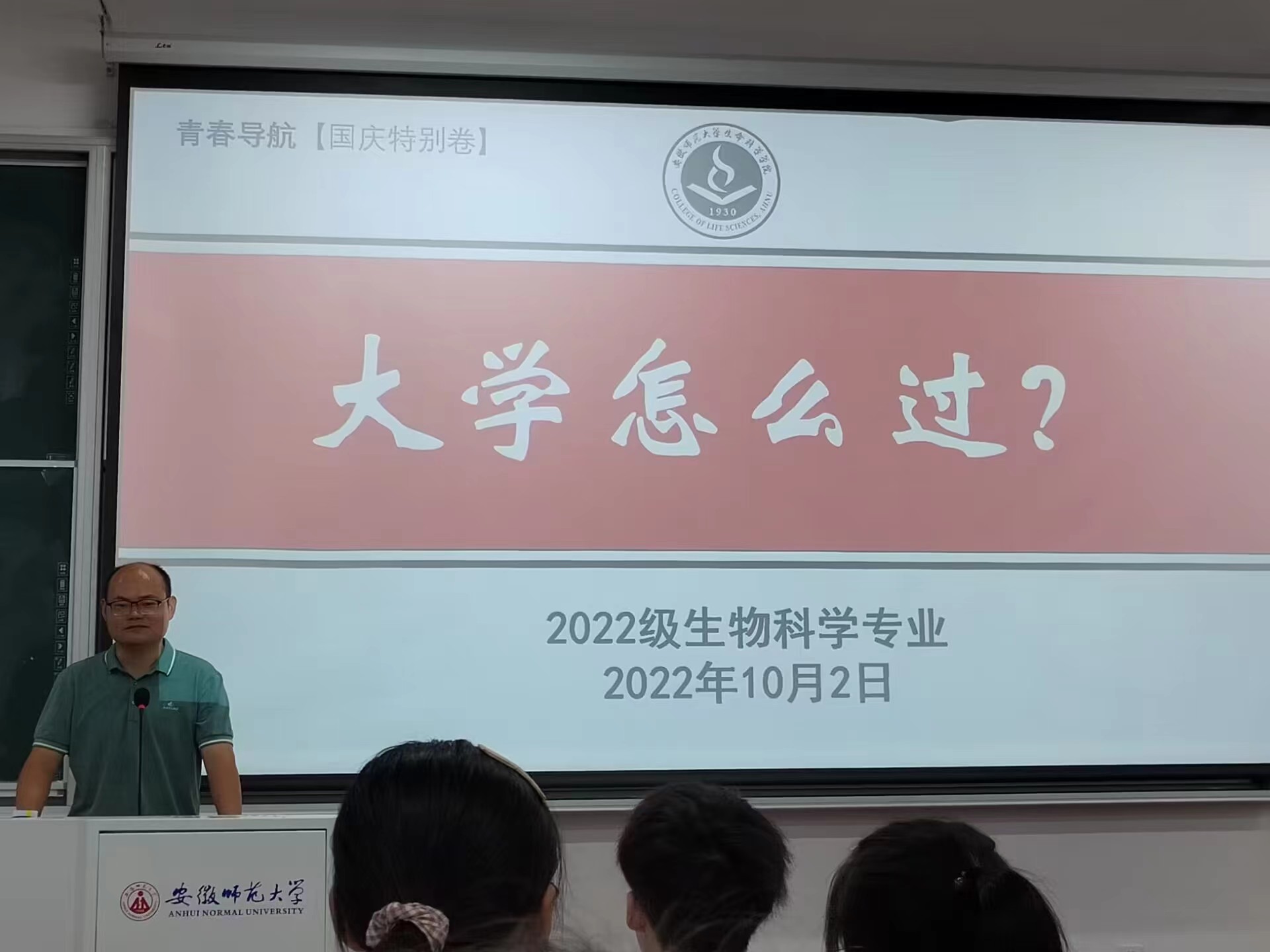 10月2日上午,2020级生物学专业研究生韩师韵、2019级生物科学专业本科生周威、2022届生物科学专业毕业生、现芜湖市弋江小学教师沈洁分别给新生做了青春导航报告。韩师韵从个人求学经验出发,介绍了个人大学和研究生学习和员工工作经验,为同学们四年做了规划建议,向同学们分享了她科研经验。周威以“诗和远方”为题,分享了他四年班长工作、学习经历,着重介绍了他参加学科竞赛的心路历程。沈洁介绍了个人师范生成长经验,详细讲述了大学期间参加的师范生技能比赛等经历,并着重指导新生如何上好一节微课。
