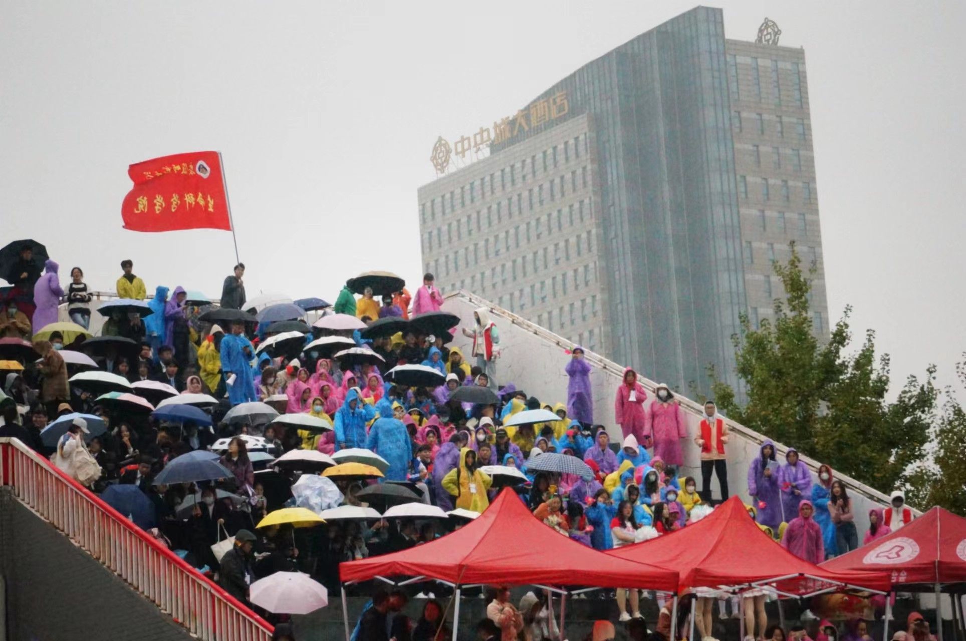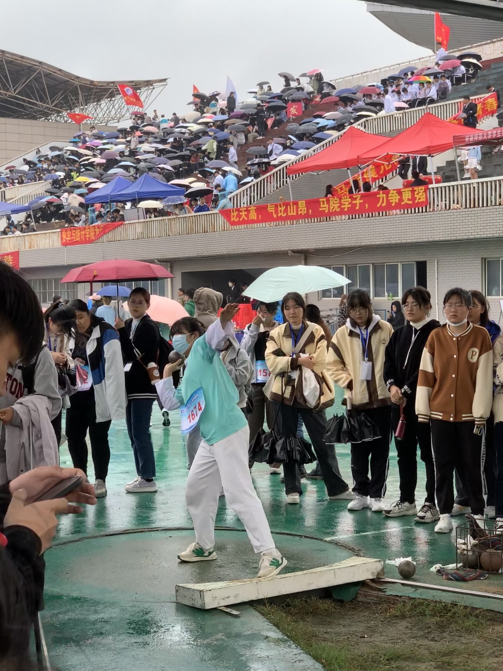 图为观众兴致昂扬,冒雨观看,为选手加油画面