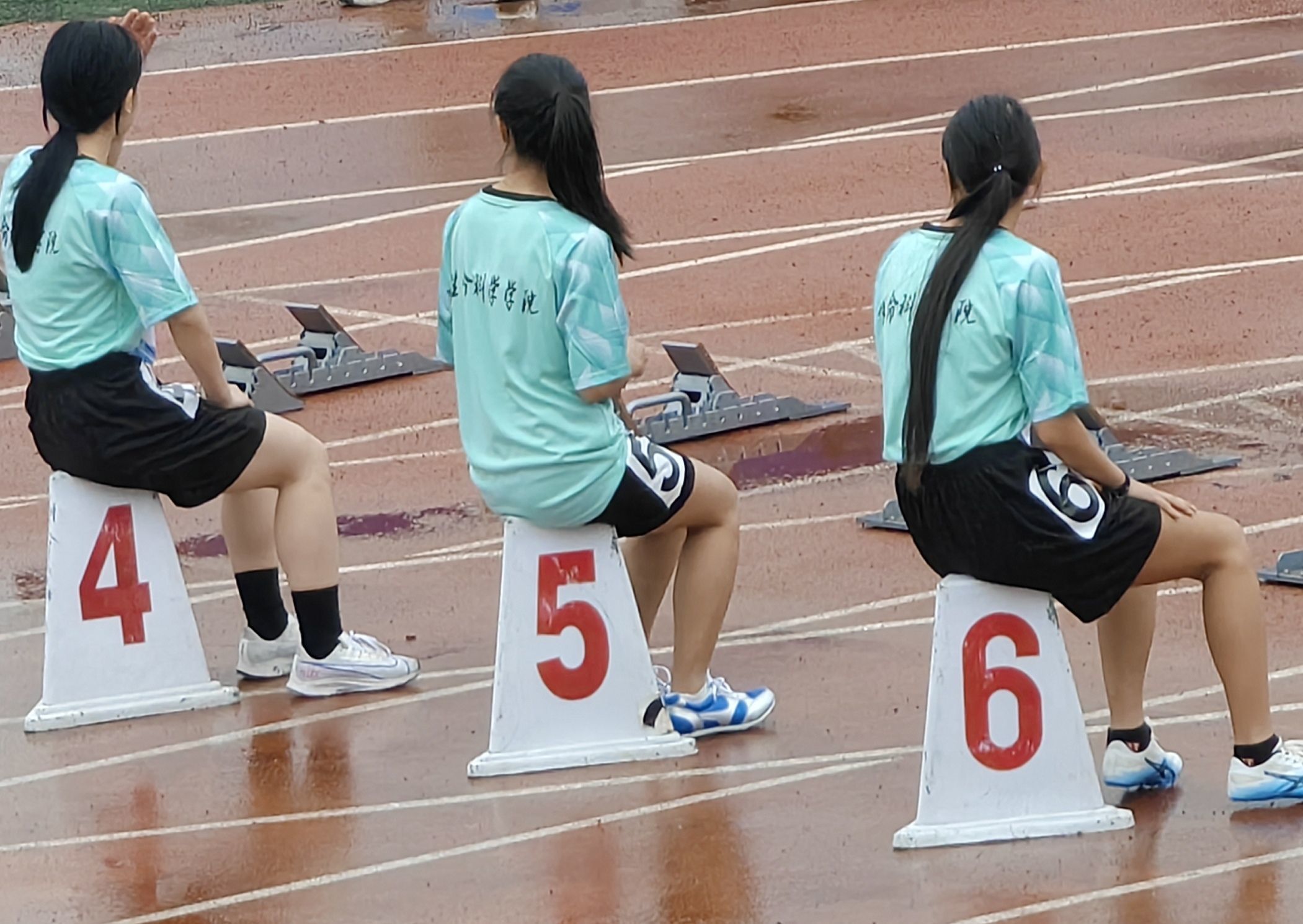 图为女子100m决赛选手蔡咪咪,黄秋燕,杨珺乔同学候场画面