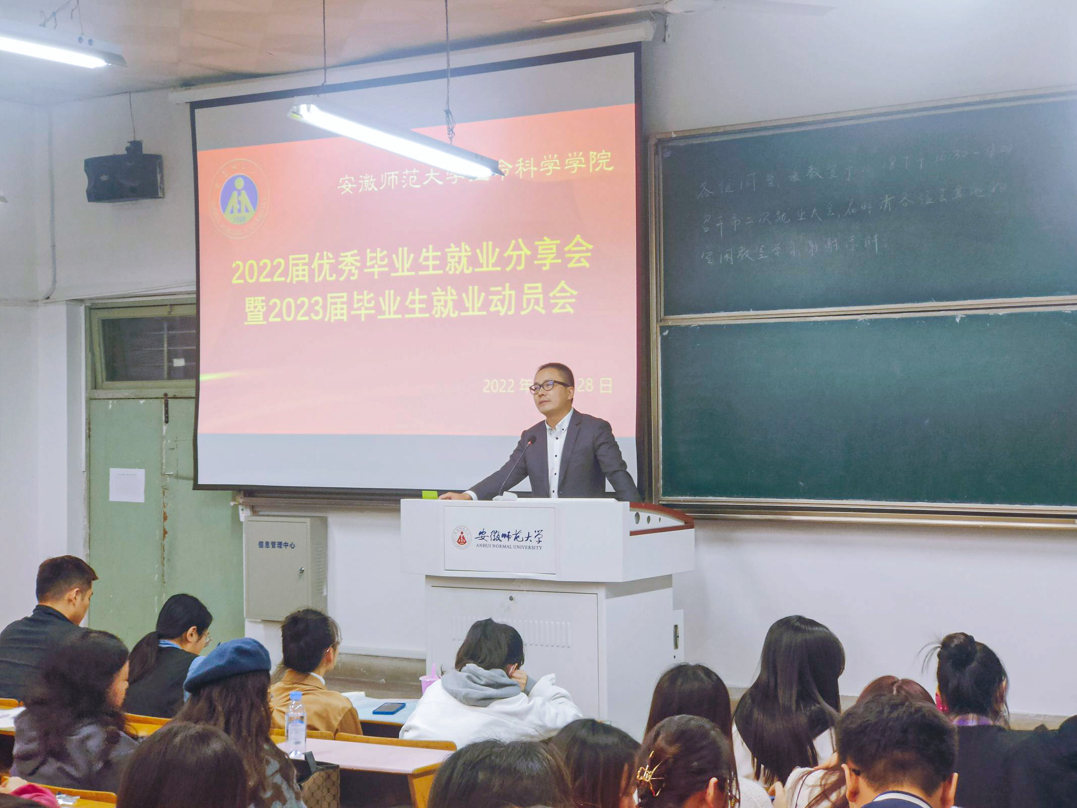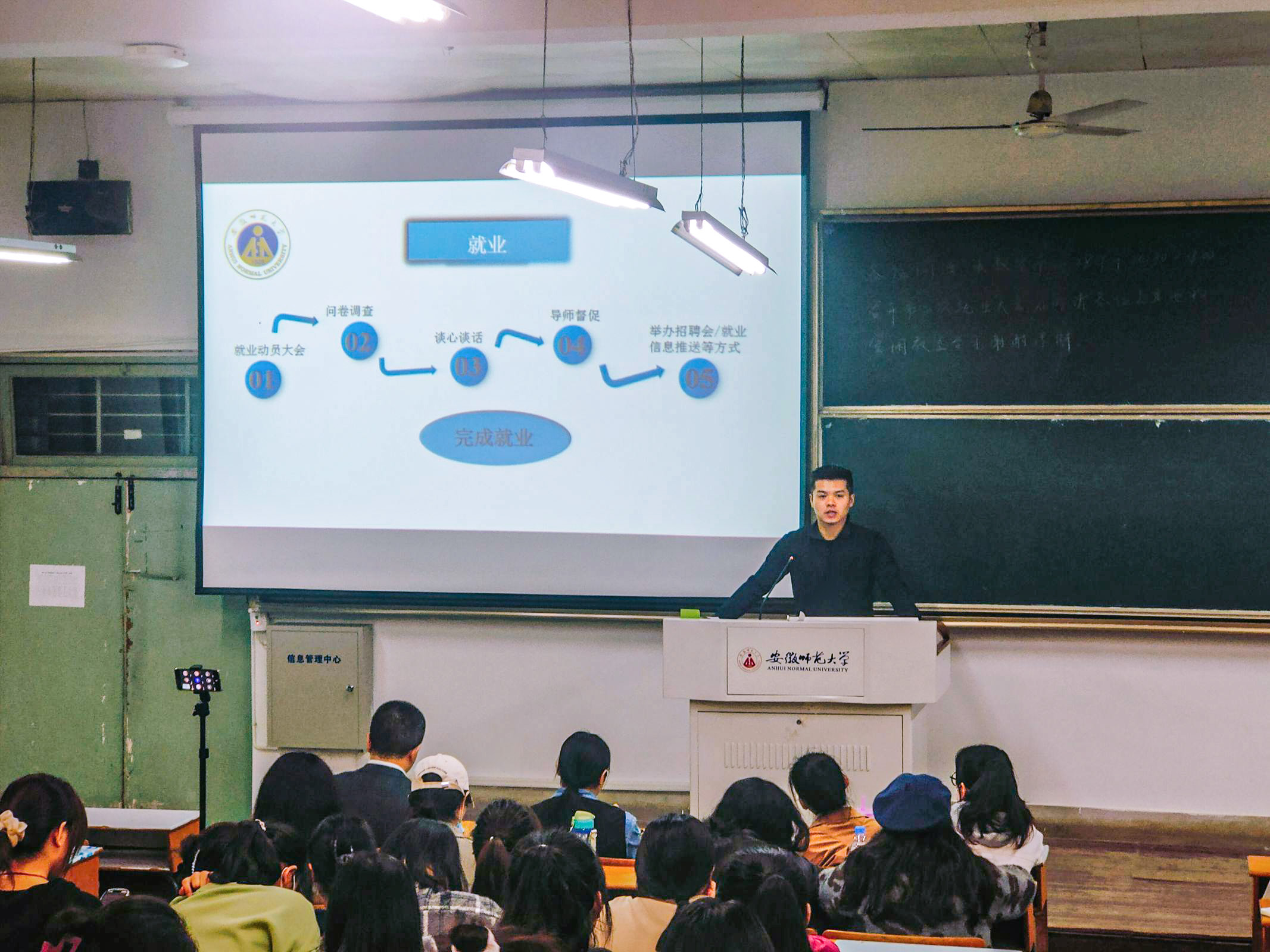 随后,研究生辅导员魏泽坤对上届就业情况以及公司2022届毕业生就业帮扶工作作出总结,详细介绍了安徽省高校征兵工作的新变革及毕业生就业网签流程,同时对2023届毕业研究生就业给予建议:明确目标、多去尝试、集合多方资源、踏实备考。