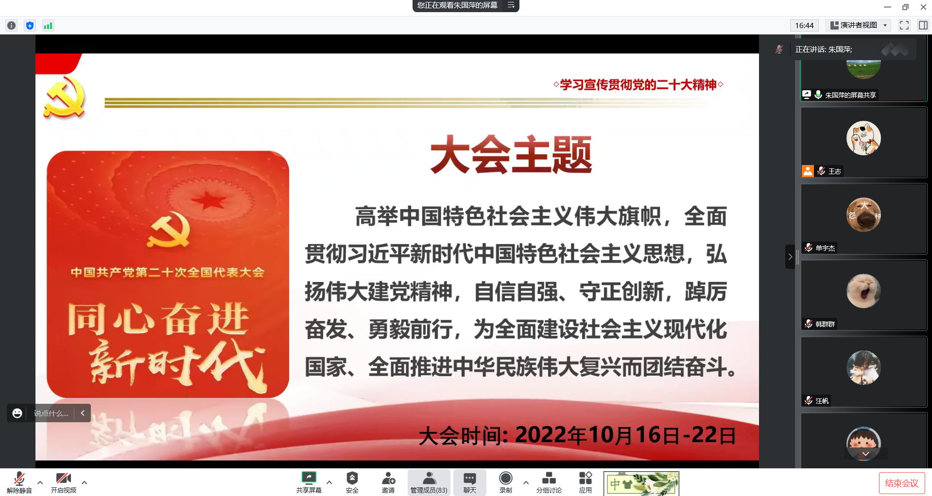 朱国萍老师从大会主题谈起,从“牢牢把握过去5年工作和新时代10年伟大变革的重大意义”“牢牢把握习近平新时代中国特色社会主义思想的世界观和方法论”“牢牢把握以中国式现代化推进中华民族伟大复兴的使命任务”“牢牢把握以伟大自我革命引领伟大社会革命的重要要求”“牢牢把握团结奋斗的时代要求”和“二十大报告的其他创新点”等六方面深刻解读了党的二十大的核心要义和精神内涵,课程中穿插了数据、图片和视频,思政课生动而充实。
