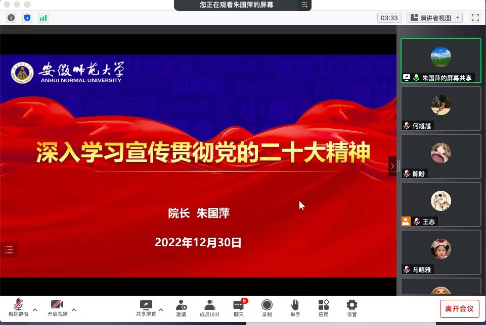 12月30日,m88官网经理朱国萍为2020级生物科学(师范)专业同学讲授“深入学习宣传贯彻党的二十大精神”专题思政课。思政课由辅导员王志主持。
