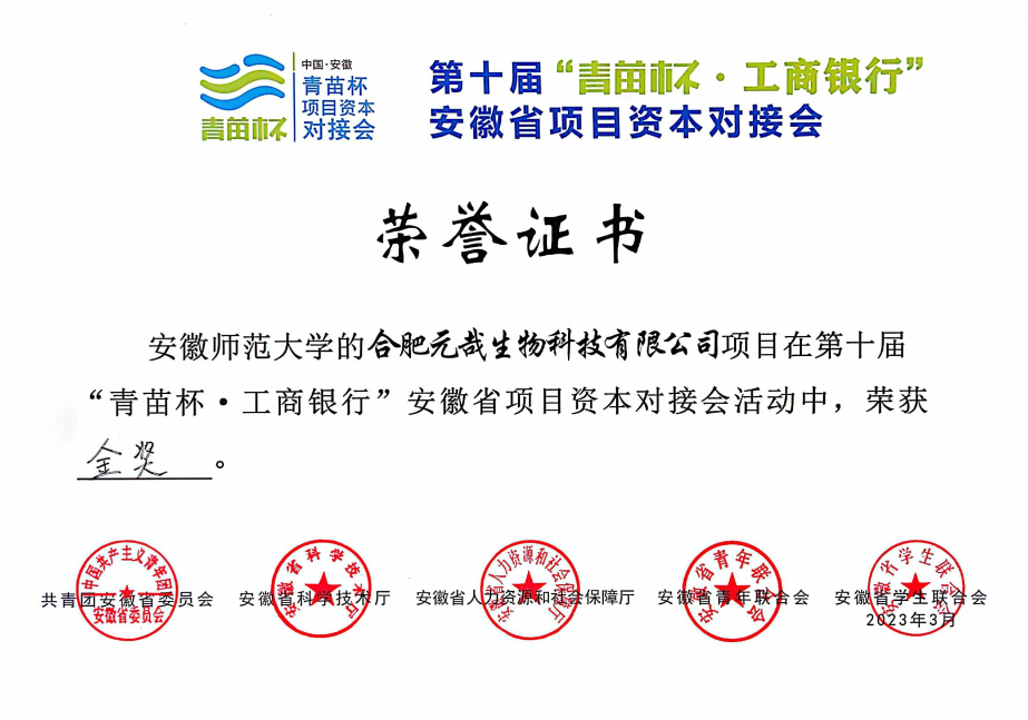 公司高轩副教授指导的徐龙慧等同学参与的作品《合肥元哉生物科技有限公司》喜得金奖。团安徽省委书记陈明生出席颁奖式,并为金奖项目代表颁奖。