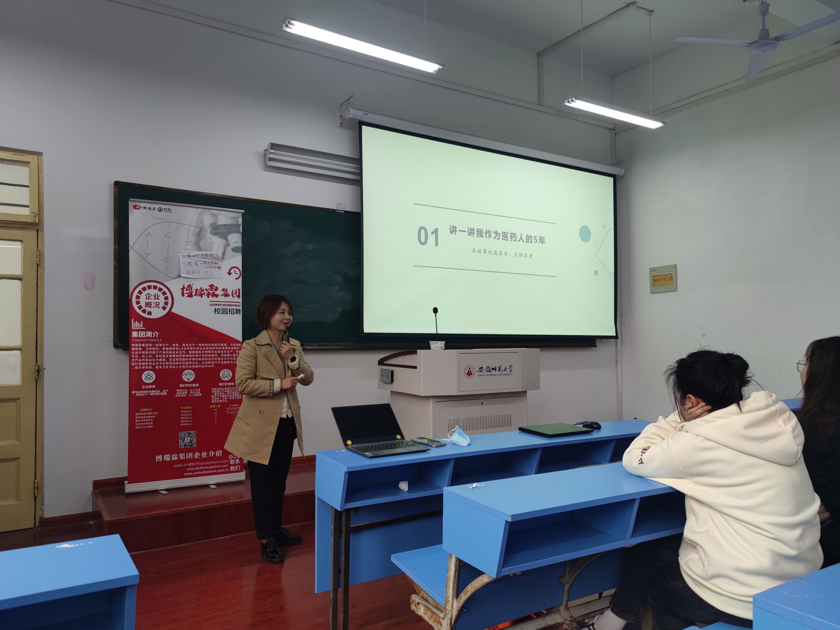 下午,博瑞霖集团地区经理公司2013级生物技术专业员工吴婷婷介绍了身为医药人毕业五年来的成长与收获,并开展专项招聘。
