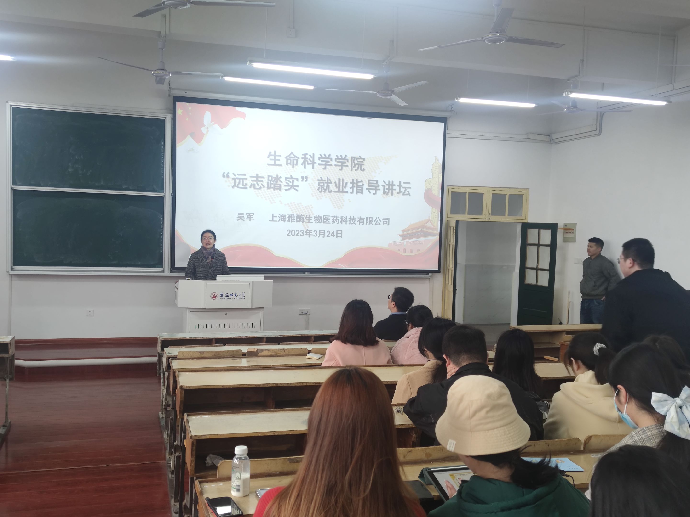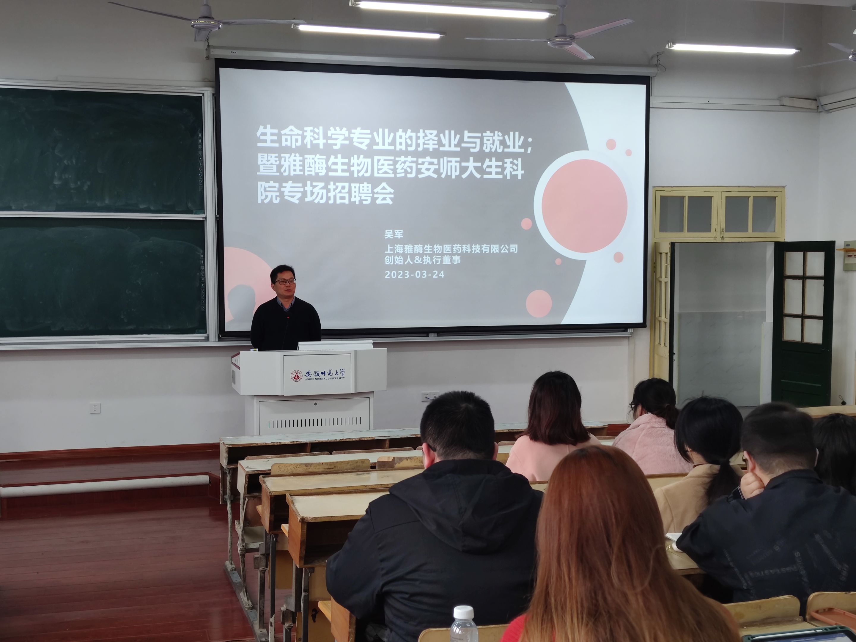 上午,上海雅酶生物医药科技有限公司总经理公司2005级生物技术专业员工吴军结合个人发展分享了求学、工作及创业经历并介绍了上海雅酶生物医药科技有限公司的发展,会后开展专项招聘。
